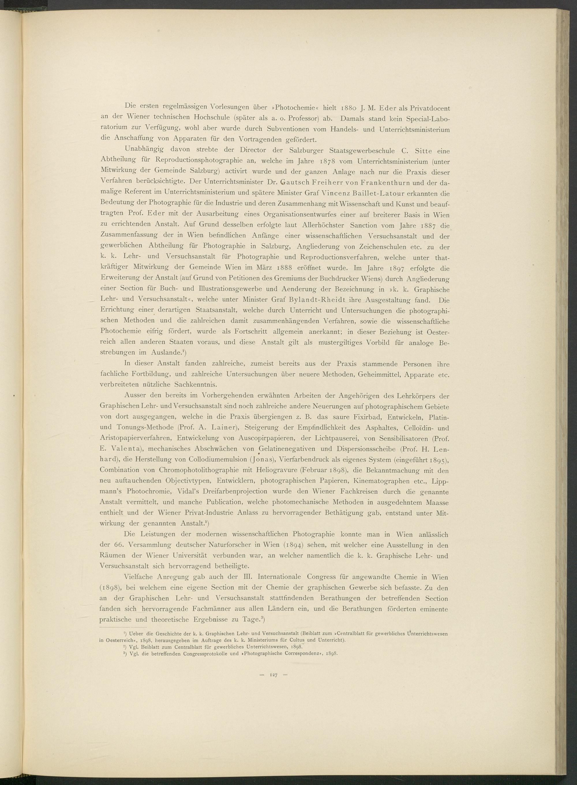 Unabhängig davon strebte der Director der Salzburger Staatsgewerbeschule C. Sitte eine Abtheilung für Reproductionsphotographie an, welche im Jahre 1878 vom Unterrichtsministerium (unter Mitwirkung der Gemeinde Salzburg) activirt wurde und der ganzen Anlage nach nur die Praxis dieser Verfahren berücksichtigte. Der Unterrichtsminister Dr. Gautsch Freiherr von Frankenthurn und der damalige Referent im Unterrichtsministerium und spätere Minister Graf Vincenz Baillet-Latour erkannten die Bedeutung der Photographie für die Industrie und deren Zusammenhang mit Wissenschaft und Kunst und beauftragten Prof. Eder mit der Ausarbeitung eines Organisationsentwurfes einer auf breiterer Basis in Wien zu errichtenden Anstalt. Auf Grund desselben erfolgte laut Allerhöchster Sanction vom Jahre 1887 die Zusammenfassung der in Wien befindlichen Anfänge einer wissenschaftlichen Versuchsanstalt und der gewerblichen Abtheilung für Photographie in Salzburg, Angliederung von Zeichenschulen etc. zu der k. k. Lehr- und Versuchsanstalt für Photographie und Reproductionsverfahren, welche unter that- kräftiger Mitwirkung der Gemeinde Wien im März 1888 eröffnet wurde. Im Jahre 1897 erfolgte die Erweiterung der Anstalt (auf Grund von Petitionen des Gremiums der Buchdrucker Wiens) durch Angliederung einer Section für Buch- und Illustrationsgewerbe und Aenderung der Bezeichnung in »k. k. Graphische Lehr- und Versuchsanstalt«, welche unter Minister Graf Bylandt-Rheidt ihre Ausgestaltung fand. Die Errichtung einer derartigen Staatsanstalt, welche durch Unterricht und Untersuchungen die photographischen Methoden und die zahlreichen damit zusammenhängenden Verfahren, sowie die wissenschaftliche Photochemie eifrig fördert, wurde als Fortschritt allgemein anerkannt; in dieser Beziehung ist Oesterreich allen anderen Staaten voraus, und diese Anstalt gilt als mustergiltiges Vorbild für analoge Bestrebungen im Auslande. 1 )