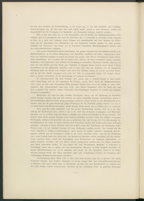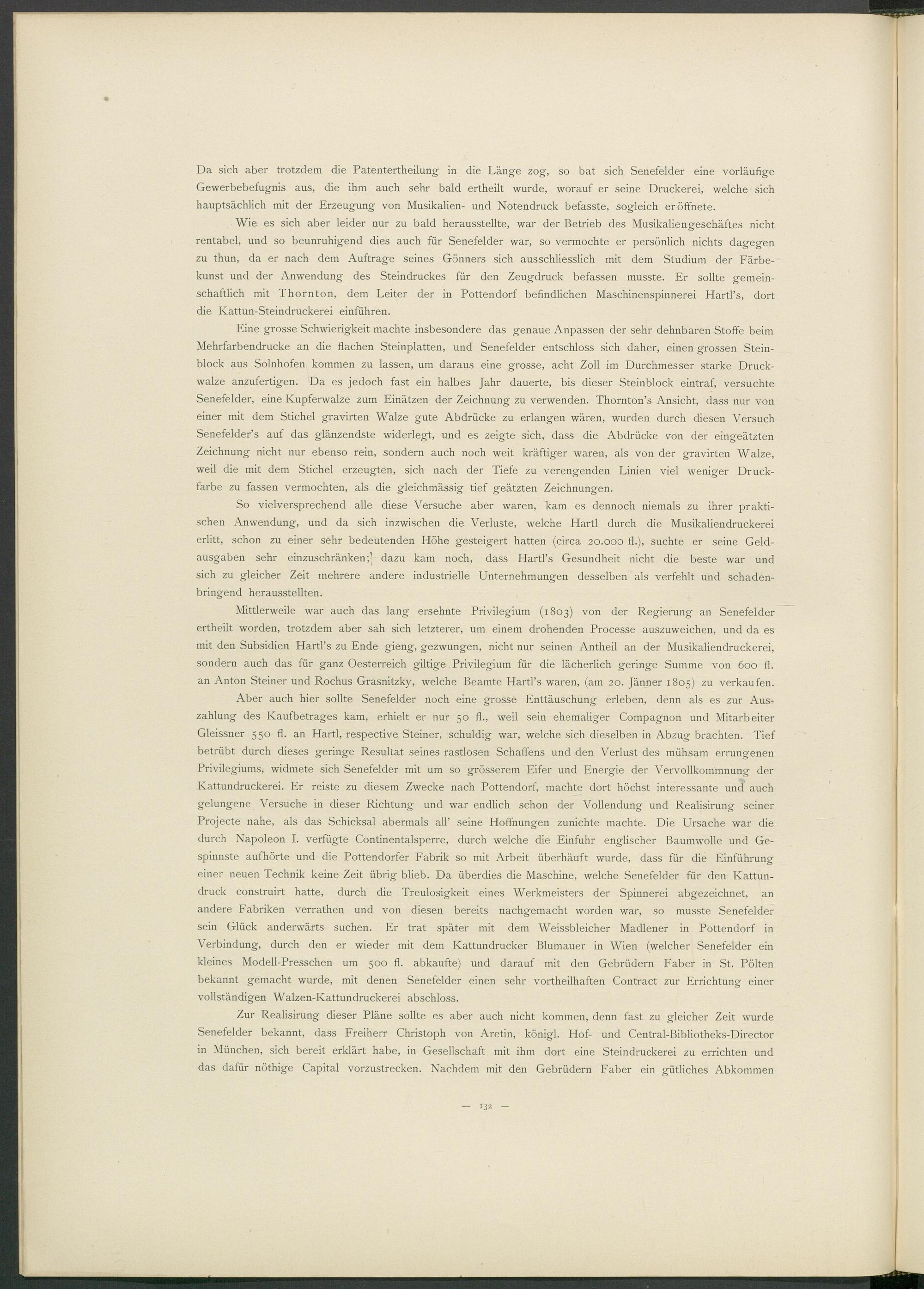 Aber auch hier sollte Senefelder noch eine grosse Enttäuschung erleben, denn als es zur Auszahlung des Kaufbetrages kam, erhielt er nur 50 fl., weil sein ehemaliger Compagnon und Mitarbeiter Gleissner 550 fl. an Hartl, respective Steiner, schuldig war, welche sich dieselben in Abzug brachten. Tief betrübt durch dieses geringe Resultat seines rastlosen Schaffens und den Verlust des mühsam errungenen Privilegiums, widmete sich Senefelder mit um so grösserem Eifer und Energie der Vervollkommnung der Kattundruckerei. Er reiste zu diesem Zwecke nach Pottendorf, machte dort höchst interessante und auch gelungene Versuche in dieser Richtung und war endlich schon der Vollendung und Realisirung seiner Projecte nahe, als das Schicksal abermals all’ seine Hoffnungen zunichte machte. Die Ursache war die durch Napoleon I. verfügte Continentalsperre, durch welche die Einfuhr englischer Baumwolle und Ge- spinnste auf hörte und die Pottendorfer Fabrik so mit Arbeit überhäuft wurde, dass für die Einführung einer neuen Technik keine Zeit übrig blieb. Da überdies die Maschine, welche Senefelder für den Kattundruck construirt hatte, durch die Treulosigkeit eines Werkmeisters der Spinnerei abgezeichnet, an andere Fabriken verrathen und von diesen bereits nachgemacht worden war, so musste Senefelder sein Glück anderwärts suchen. Er trat später mit dem Weissbleicher Madlener in Pottendorf in Verbindung, durch den er wieder mit dem Kattundrucker Blumauer in Wien (welcher Senefelder ein kleines Modell-Presschen um 500 fl. abkaufte) und darauf mit den Gebrüdern Faber in St. Pölten bekannt gemacht wurde, mit denen Senefelder einen sehr vortheilhaften Contract zur Errichtung einer vollständigen Walzen-Kattundruckerei abschloss.