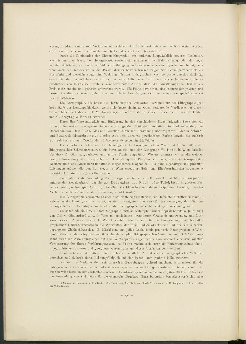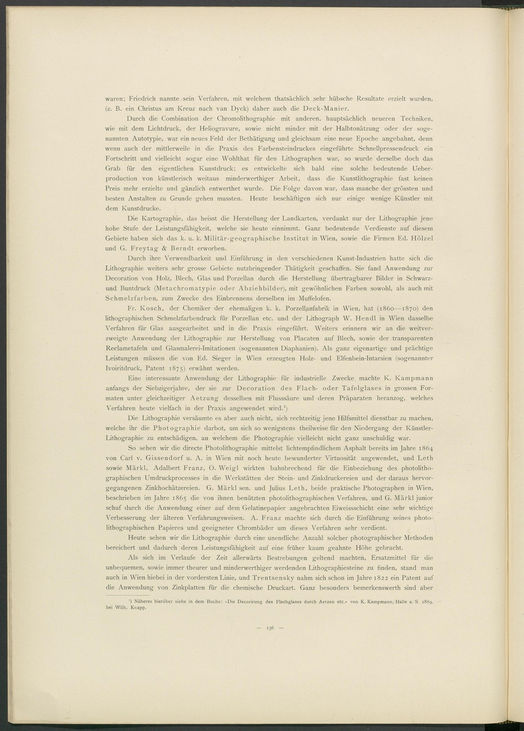Eine interessante Anwendung der Lithographie für industrielle Zwecke machte K. Kampmann anfangs der Siebzigerjahre, der sie zur Decoration des Flach- oder Tafelglases in grossen Formaten unter gleichzeitiger Aetzung desselben mit Flusssäure und deren Präparaten heranzog, welches Verfahren heute vielfach in der Praxis angewendet wird. 1 )
