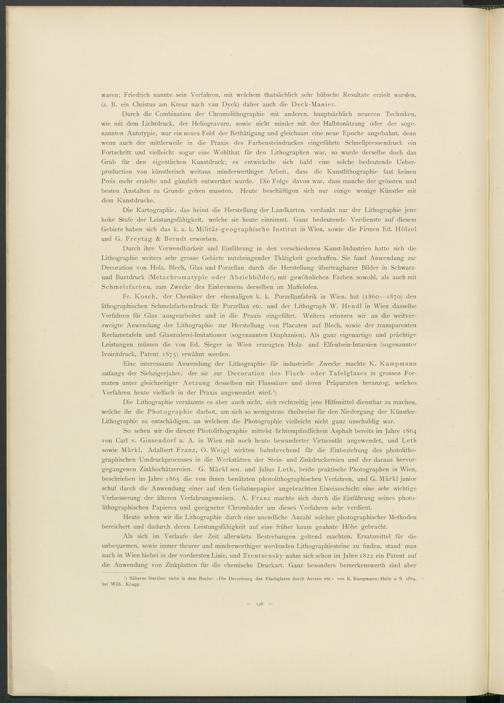 Die Kartographie, das heisst die Fierstellung der Landkarten, verdankt nur der Lithographie jene hohe Stufe der Leistungsfähigkeit, welche sie heute einnimmt. Ganz bedeutende Verdienste auf diesem Gebiete haben sich das k. u. k. Militär-geographische Institut in Wien, sowie die Firmen Ed. Hölzel und G. Freytag & Berndt erworben.
