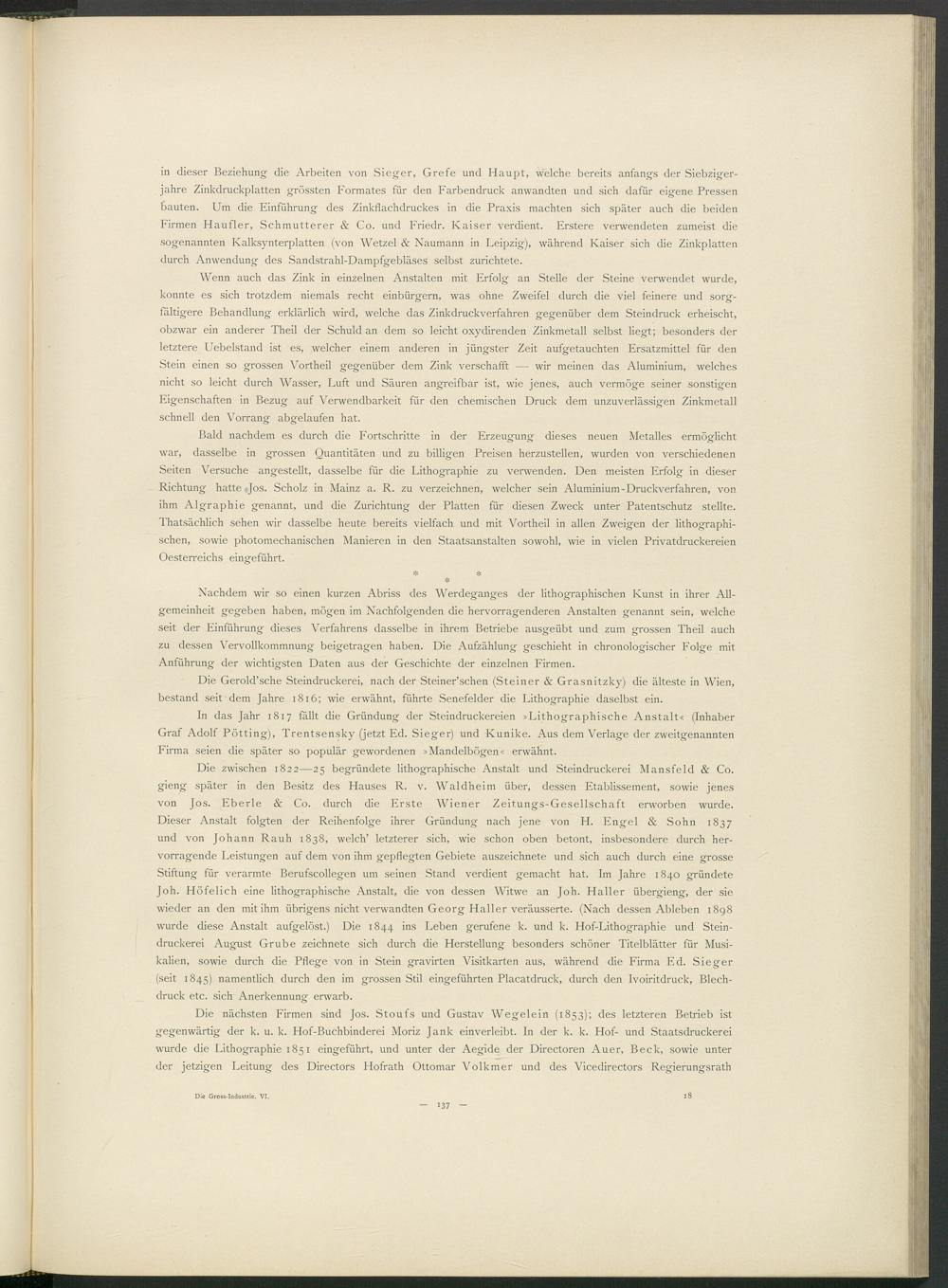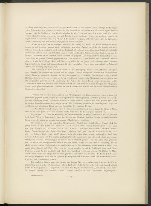 Die zwischen 1822—25 begründete lithographische Anstalt und Steindruckerei Mansfeld & Co. gieng später in den Besitz des Hauses R. v. Waldheim über, dessen Etablissement, sowie jenes von Jos. Eberle & Co. durch die Erste Wiener Zeitungs-Gesellschaft erworben wurde. Dieser Anstalt folgten der Reihenfolge ihrer Gründung nach jene von H. Engel & Sohn 1837 und von Johann Rauh 1838, welch’ letzterer sich, wie schon oben betont, insbesondere durch hervorragende Leistungen auf dem von ihm gepflegten Gebiete auszeichnete und sich auch durch eine grosse Stiftung für verarmte Berufscollegen um seinen Stand verdient gemacht hat. Im Jahre 1840 gründete Joh. Höfelich eine lithographische Anstalt, die von dessen Witwe an Joh. Haller übergieng, der sie wieder an den mit ihm übrigens nicht verwandten Georg Haller veräusserte. (Nach dessen Ableben 1898 wurde diese Anstalt aufgelöst.) Die 1844 ins Leben gerufene k. und k. Hof-Lithographie und Steindruckerei August Grube zeichnete sich durch die Herstellung besonders schöner Titelblätter für Musikalien, sowie durch die Pflege von in Stein gravirten Visitkarten aus, während die Firma Ed. Sieger (seit 1845) namentlich durch den im grossen Stil eingeführten Placatdruck, durch den Ivoiritdruck, Blechdruck etc. sich Anerkennung erwarb.