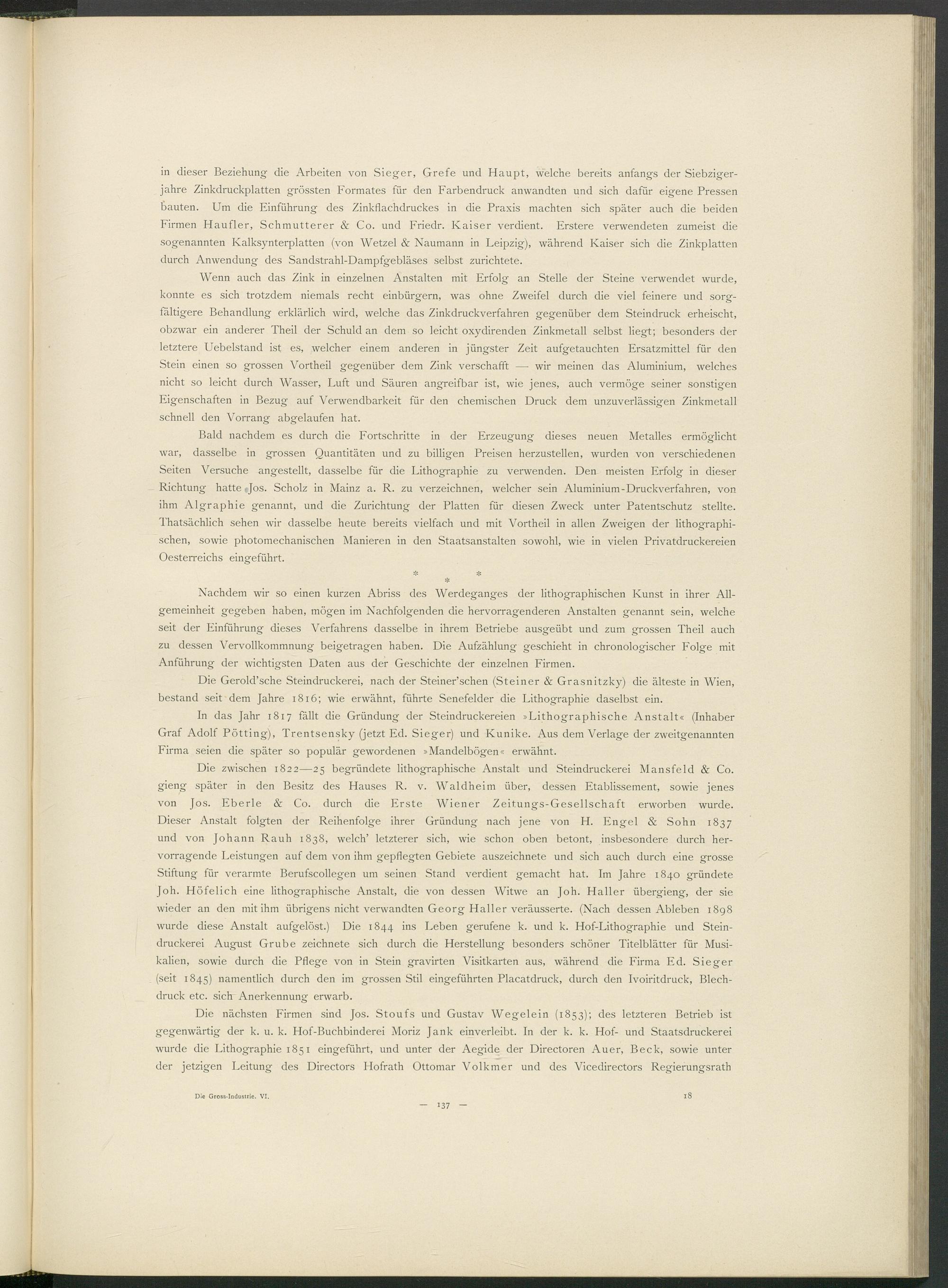 in dieser Beziehung die Arbeiten von Sieger, Grefe und Haupt, welche bereits anfangs der Siebzigerjahre Zinkdruckplatten grössten Formates für den Farbendruck anwandten und sich dafür eigene Pressen bauten. Um die Einführung des Zinkflachdruckes in die Praxis machten sich später auch die beiden Firmen Häufler, Schmutterer & Co. und Friedr. Kaiser verdient. Erstere verwendeten zumeist die sogenannten Ivalksynterplatten (von Wetzel & Naumann in Leipzig), während Kaiser sich die Zinkplatten durch Anwendung des Sandstrahl-Dampfgebläses selbst zurichtete.