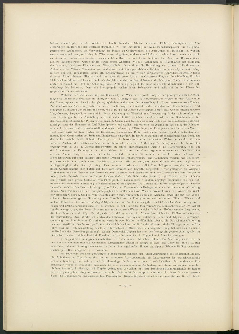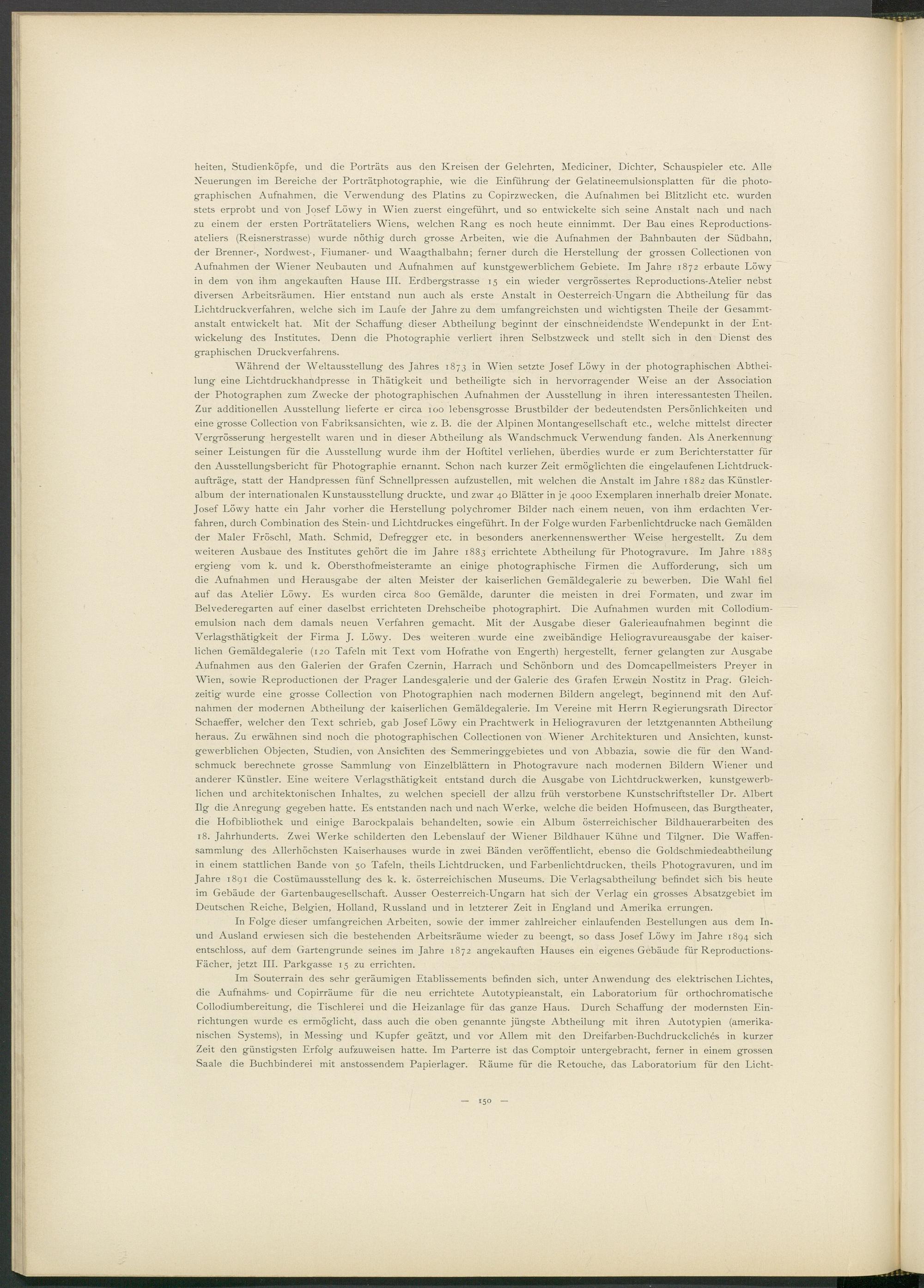 heiten, Studienköpfe, und die Porträts aus den Kreisen der Gelehrten, Mediciner, Dichter, Schauspieler etc. Alle Neuerungen im Bereiche der Porträtphotographie, wie die Einführung der Gelatineemulsionsplatten für die photographischen Aufnahmen, die Verwendung des Platins zu Copirzwecken, die Aufnahmen bei Blitzlicht etc. wurden stets erprobt und von Josef Löwy in Wien zuerst eingeführt, und so entwickelte sich seine Anstalt nach und nach zu einem der ersten Porträtateliers Wiens, welchen Rang es noch heute einnimmt. Der Bau eines Reproductions- ateliers (Reisnerstrasse) wurde nöthig durch grosse Arbeiten, wie die Aufnahmen der Bahnbauten der Südbahn, der Brenner-, Nordwest-, Fiumaner- und Waagthalbahn; ferner durch die Herstellung der grossen Collectionen von Aufnahmen der Wiener Neubauten und Aufnahmen auf kunstgewerblichem Gebiete. Im Jahre 1872 erbaute Löwy in dem von ihm angekauften Hause III. Erdbergstrasse 15 ein wieder vergrössertes Reproductions-Atelier nebst diversen Arbeitsräumen. Hier entstand nun auch als erste Anstalt in Oesterreich-Ungarn die Abtheilung für das Lichtdruckverfahren, welche sich im Laufe der Jahre zu dem umfangreichsten und wichtigsten Theile der Gesammt- anstalt entwickelt hat. Mit der Schaffung dieser Abtheilung beginnt der einschneidendste Wendepunkt in der Entwickelung des Institutes. Denn die Photographie verliert ihren Selbstzweck und stellt sich in den Dienst des graphischen Druckverfahrens.