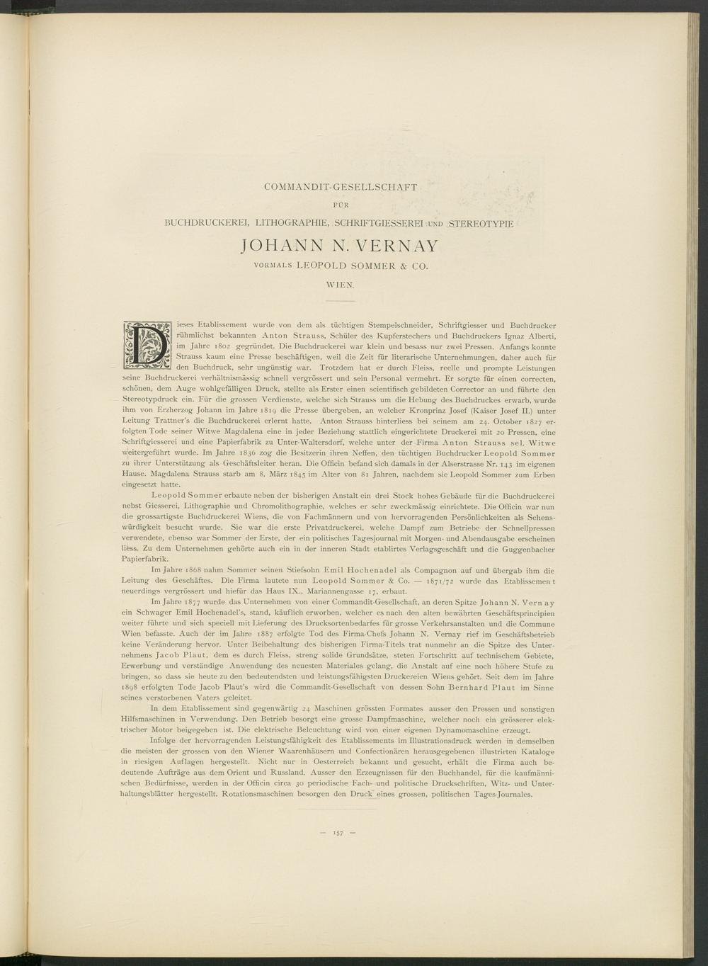 Im Jahre 1877 wurde das Unternehmen von einer Commandit-Gesellschaft, an deren Spitze Johann N. Vern ay ein Schwager Emil Hochenadel’s, stand, käuflich erworben, welcher es nach den alten bewährten Geschäftsprincipien weiter führte und sich speciell mit Lieferung des Drucksortenbedarfes für grosse Verkehrsanstalten und die Commune AVien befasste. Auch der im Jahre 1887 erfolgte Tod des Firma-Chefs Johann N. AArnay rief im Geschäftsbetrieb keine Veränderung hervor. Unter Beibehaltung des bisherigen Firma-Titels trat nunmehr an die Spitze des Unternehmens Jacob Plaut, dem es durch Fleiss, streng solide Grundsätze, steten Fortschritt auf technischem Gebiete, Erwerbung und verständige Anwendung des neuesten Materiales gelang, die Anstalt auf eine noch höhere Stufe zu bringen, so dass sie heute zu den bedeutendsten und leistungsfähigsten Druckereien Wiens gehört. Seit dem im Jahre 1898 erfolgten Tode Jacob Plaut’s wird die Commandit-Gesellschaft von dessen Sohn Bernhard Plaut im Sinne seines verstorbenen Vaters geleitet.