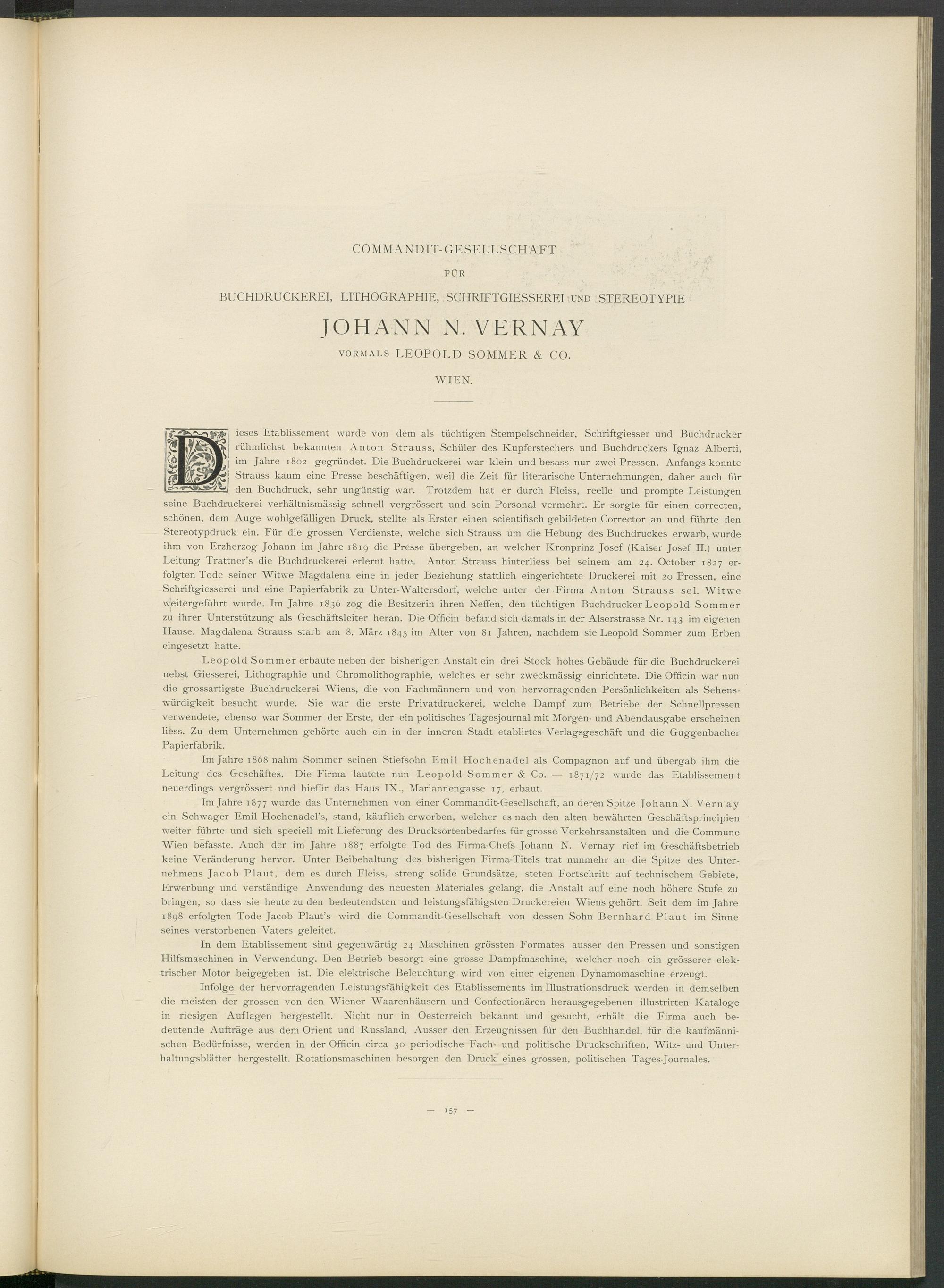 ieses Etablissement wurde von dem als tüchtigen Stempelschneider, Schriftgiesser und Buchdrucker rühmlichst bekannten Anton Strauss, Schüler des Kupferstechers und Buchdruckers Ignaz Alberti, im Jahre 1802 gegründet. Die Buchdruckerei war klein und besass nur zwei Pressen. Anfangs konnte Strauss kaum eine Presse beschäftigen, weil die Zeit für literarische Unternehmungen, daher auch für den Buchdruck, sehr ungünstig war. Trotzdem hat er durch Fleiss, reelle und prompte Leistungen seine Buchdruckerei verhältnismässig schnell vergrössert und sein Personal vermehrt. Er sorgte für einen correcten, schönen, dem Auge wohlgefälligen Druck, stellte als Erster einen scientifisch gebildeten Corrector an und führte den Stereotypdruck ein. Für die grossen AArdienste, w T elche sich Strauss um die Hebung des Buchdruckes erwarb, wurde ihm von Erzherzog Johann im Jahre 1819 die Presse übergeben, an welcher Kronprinz Josef (Kaiser Josef II.) unter Leitung Trattner’s die Buchdruckerei erlernt hatte. Anton Strauss hinterliess bei seinem am 24. October 1827 erfolgten Tode seiner Witwe Magdalena eine in jeder Beziehung stattlich eingerichtete Druckerei mit 20 Pressen, eine Schriftgiesserei und eine Papierfabrik zu Unter-Waltersdorf, welche unter der Firma Anton Strauss sei. Witwe weitergeführt wurde. Im Jahre 1836 zog die Besitzerin ihren Neffen, den tüchtigen Buchdrucker Leopold Sommer zu ihrer Unterstützung als Geschäftsleiter heran. Die Officin befand sich damals in der Alserstrasse Nr. 143 im eigenen Hause. Magdalena Strauss starb am 8. März 1845 i m Alter von 81 Jahren, nachdem sie Leopold Sommer zum Erben eingesetzt hatte.