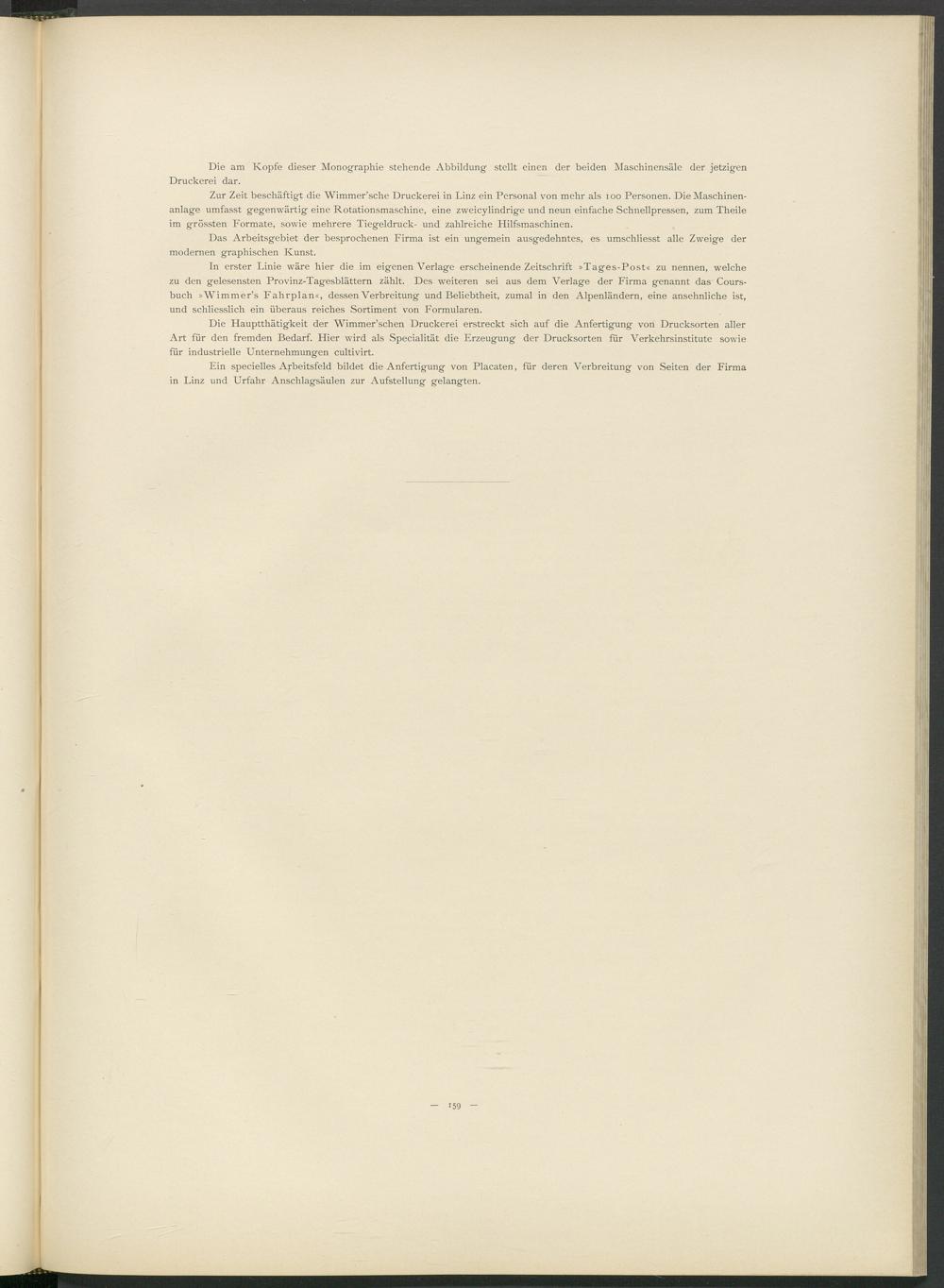 Zur Zeit beschäftigt die Wimmer’sche Druckerei in Linz ein Personal von mehr als ioo Personen. DieMaschinen- anlage umfasst gegenwärtig eine Rotationsmaschine, eine zweicylindrige und neun einfache Schnellpressen, zum Theile im grössten Formate, sowie mehrere Tiegeldruck- und zahlreiche Hilfsmaschinen.