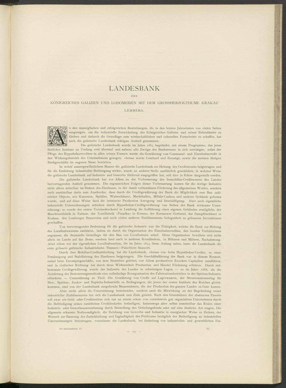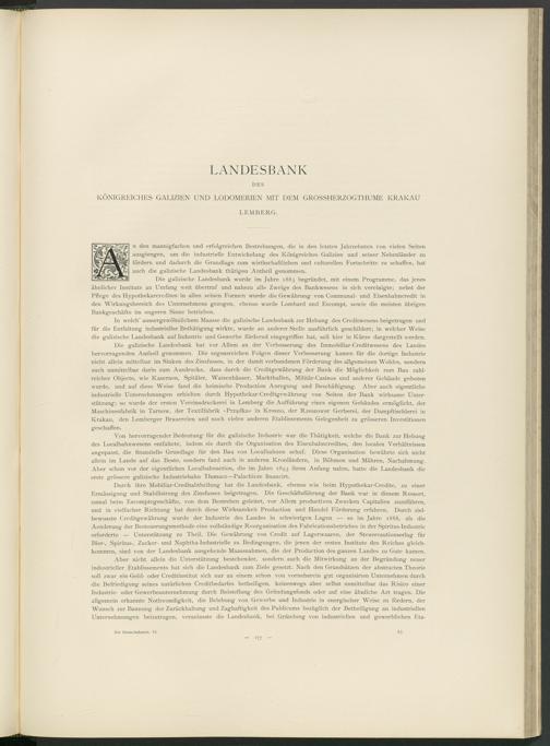 n den mannigfachen und erfolgreichen Bestrebungen, die in den letzten Jahrzehnten von vielen Seiten ausgiengen, um die industrielle Entwickelung des König-reiches Galizien und seiner Nebenländer zu fördern und dadurch die Grundlage zum wirthschaftlichen und culturellen Fortschritte zu schaffen, hat auch die galizische Landesbank thätigen Antheil genommen.