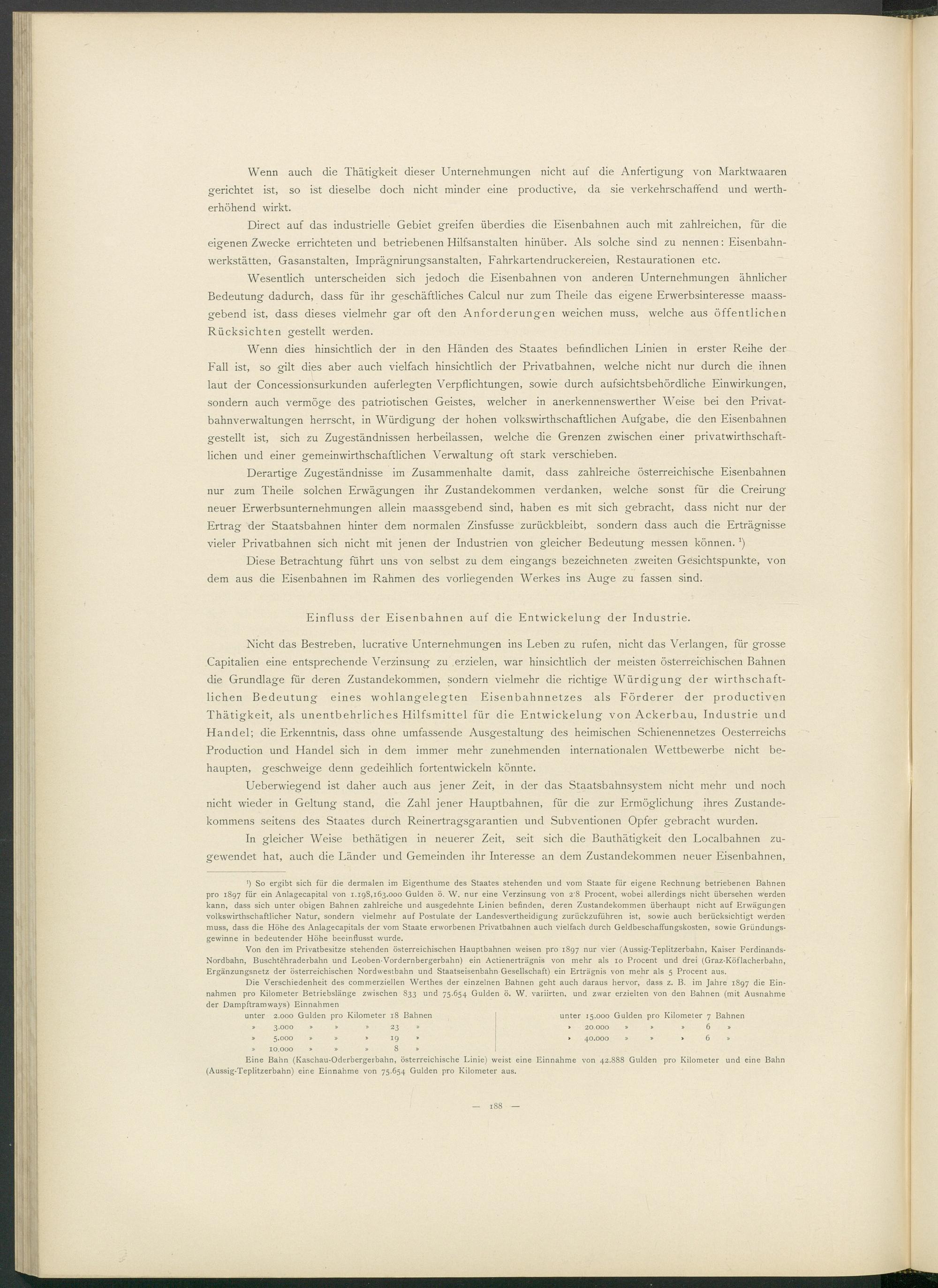 Derartige Zugeständnisse im Zusammenhalte damit, dass zahlreiche österreichische Eisenbahnen nur zum Theile solchen Erwägungen ihr Zustandekommen verdanken, welche sonst für die Creirung neuer Erwerbsunternehmungen allein maassgebend sind, haben es mit sich gebracht, dass nicht nur der Ertrag der Staatsbahnen hinter dem normalen Zinsfusse zurückbleibt, sondern dass auch die Erträgnisse vieler Privatbahnen sich nicht mit jenen der Industrien von gleicher Bedeutung messen können. *)