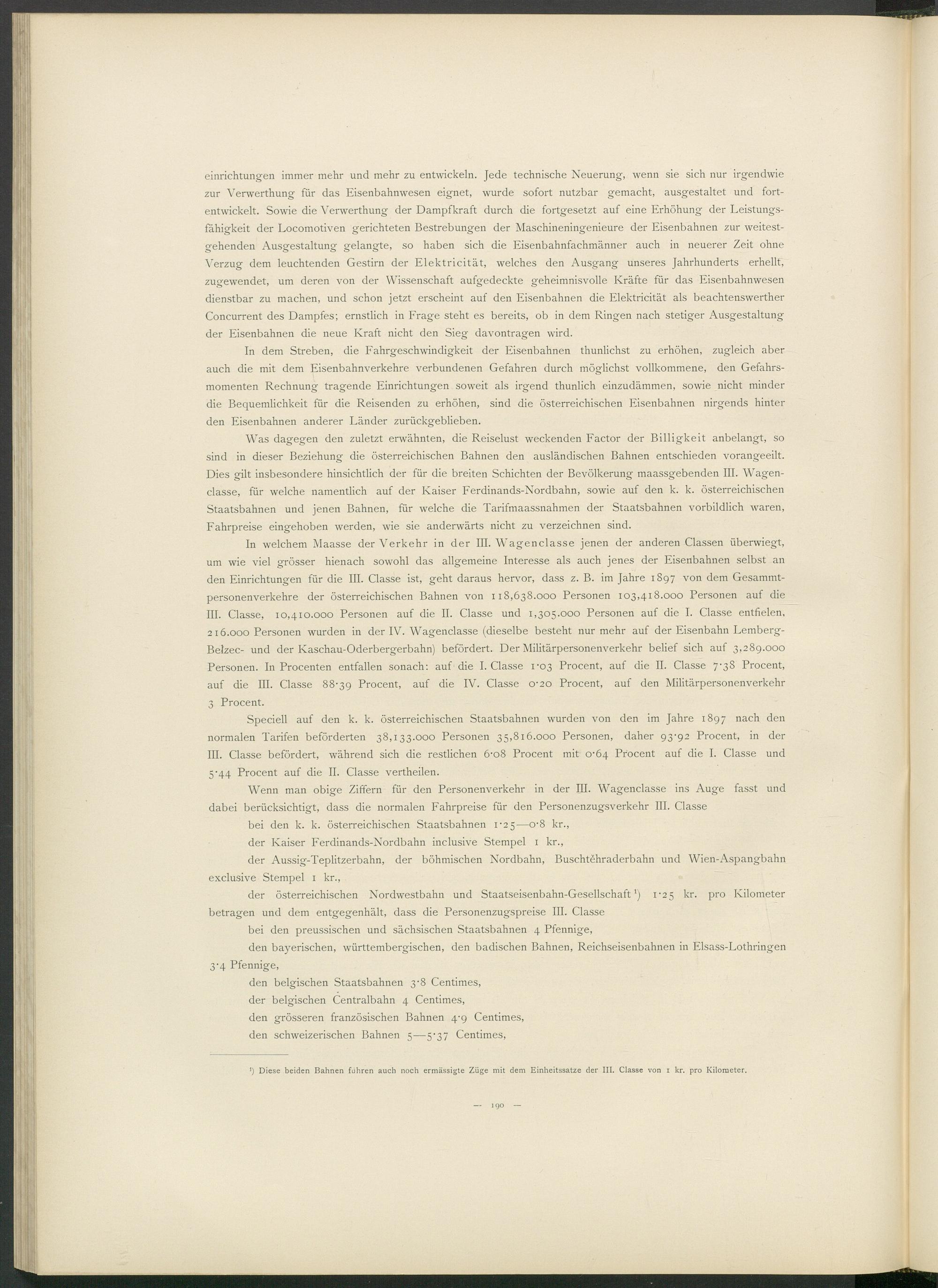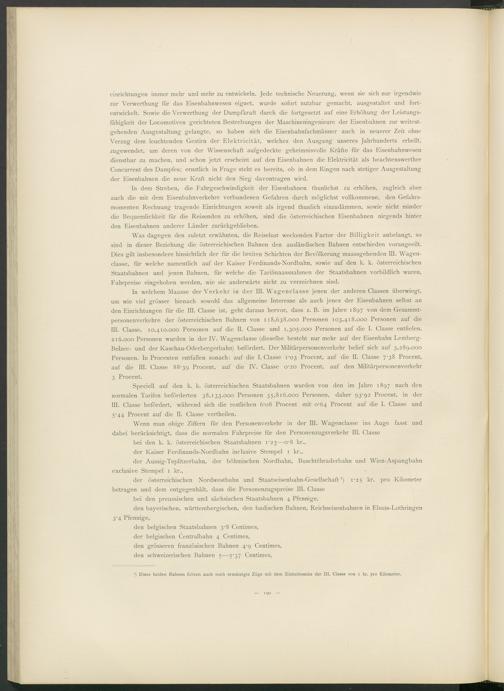 Speciell auf den k. k. österreichischen Staatsbahnen wurden von den im Jahre 1897 nach den normalen Tarifen beförderten 38,133.000 Personen 35,816.000 Personen, daher 93-92 Procent, in der III. Classe befördert, während sich die restlichen 6-o8 Procent mit 0-64 Procent auf die I. Classe und 5-44 Procent auf die II. Classe vertheilen.