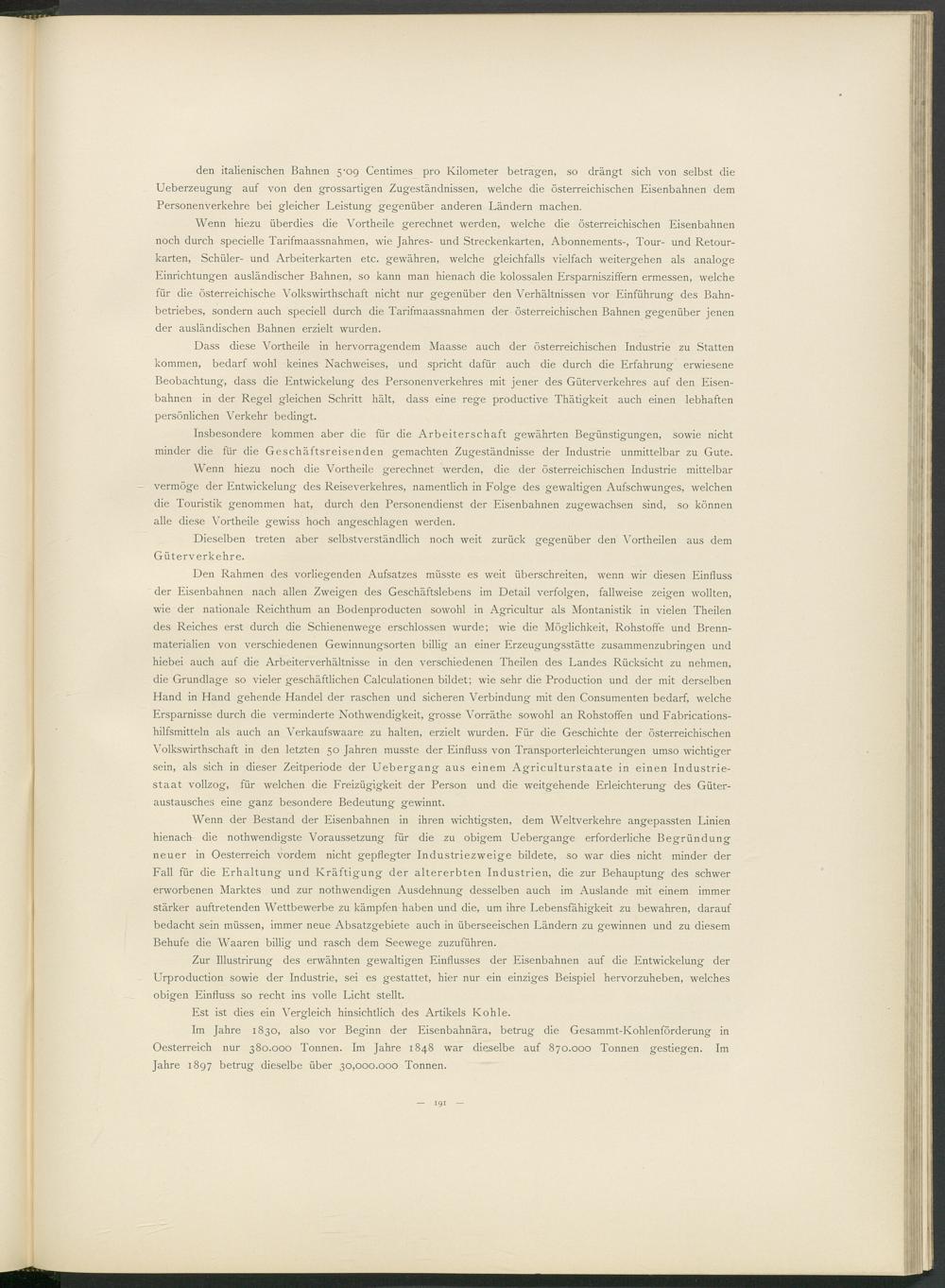 Im Jahre 1830, also vor Beginn der Eisenbahnära, betrug die Gesammt-Kohlenförderung in Oesterreich nur 380.000 Tonnen. Im Jahre 1848 war dieselbe auf 870.000 Tonnen gestiegen. Im Jahre 1897 betrug dieselbe über 30,000.000 Tonnen.