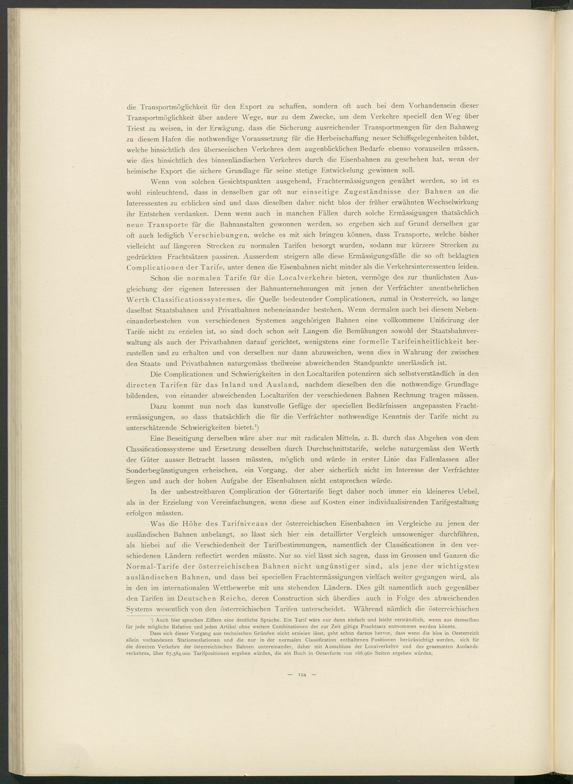 Dass sich dieser Vorgang aus technischen Gründen nicht erzielen lässt, geht schon daraus hervor, dass wenn die blos in Oesterreich allein vorhandenen Stationsrelationen und die nur in der normalen Classification enthaltenen Positionen berücksichtigt werden, sich für die directen Verkehre der österreichischen Bahnen untereinander, daher mit Ausschluss der Localverkehre und des gesammten Auslandsverkehres, über 67,584.000 Tarifpositionen ergeben würden, die ein Buch in Octavform von 168.960 Seiten ergeben würden.