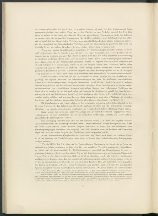 Was die Höhe des Tarifniveaus der österreichischen Eisenbahnen im Vergleiche zu jenen der ausländischen Bahnen anbelangt, so lässt sich hier ein detaillirter Vergleich umsoweniger durchführen, als hiebei auf die Verschiedenheit der Tarifbestimmungen, namentlich der Classificationen in den verschiedenen Ländern reflectirt werden müsste. Nur so viel lässt sich sagen, dass im Grossen und Ganzen die Normal-Tarife der österreichischen Bahnen nicht ungünstiger sind, als jene der wichtigsten ausländischen Bahnen, und dass bei speciellen Frachtermässigungen vielfach weiter gegangen wird, als in den im internationalen Wettbewerbe mit uns stehenden Ländern. Dies gilt namentlich auch g-egfenüber den Tarifen im Deutschen Reiche, deren Construction sich überdies auch in Folge des abweichenden Systems wesentlich von den österreichischen Tarifen unterscheidet. Während nämlich die österreichischen