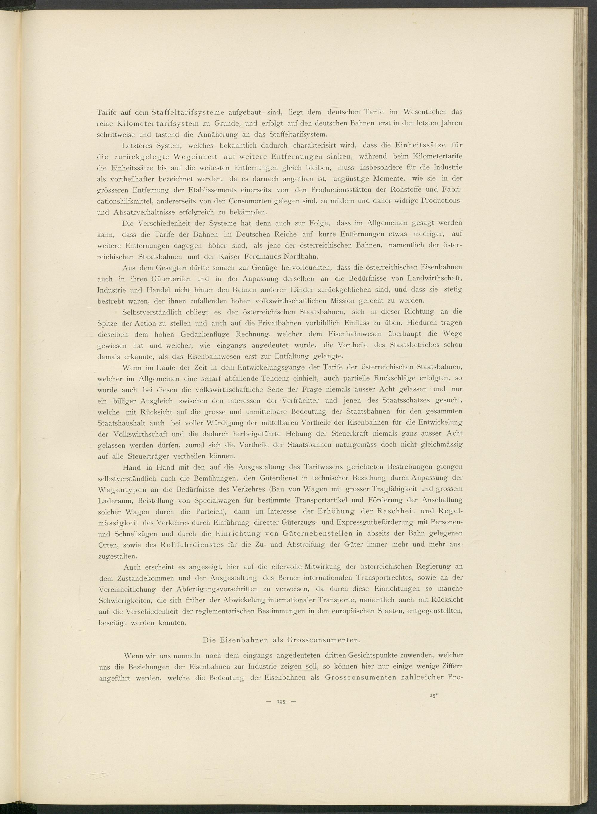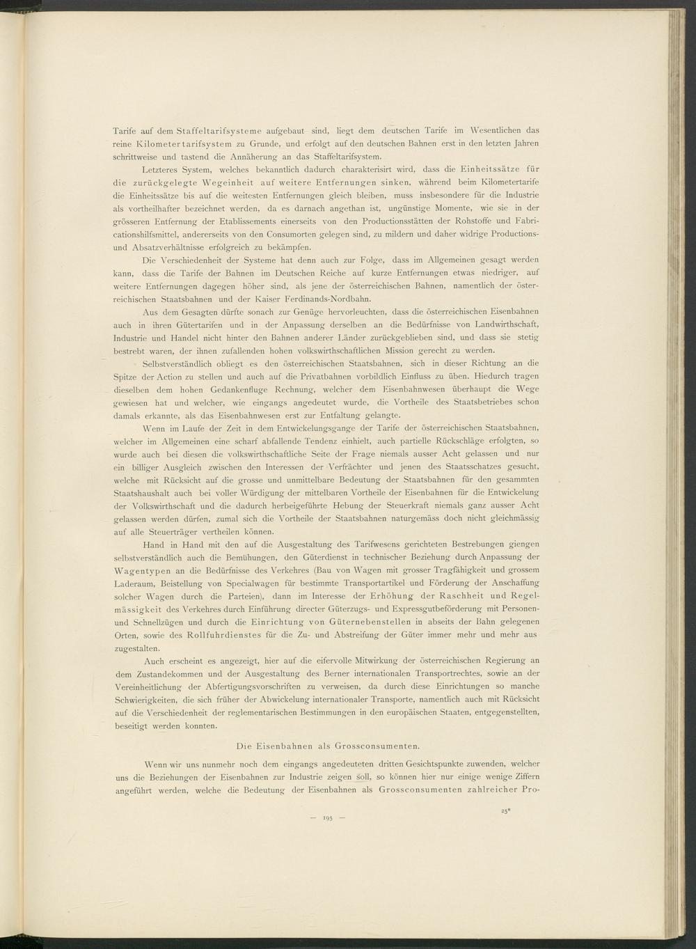 Aus dem Gesagten dürfte sonach zur Genüge hervorleuchten, dass die österreichischen Eisenbahnen auch in ihren Gütertarifen und in der Anpassung derselben an die Bedürfnisse von Landwirthschaft, Industrie und Handel nicht hinter den Bahnen anderer Länder zurückgeblieben sind, und dass sie stetig bestrebt waren, der ihnen zufallenden hohen volkswirthschaftlichen Mission gerecht zu werden.