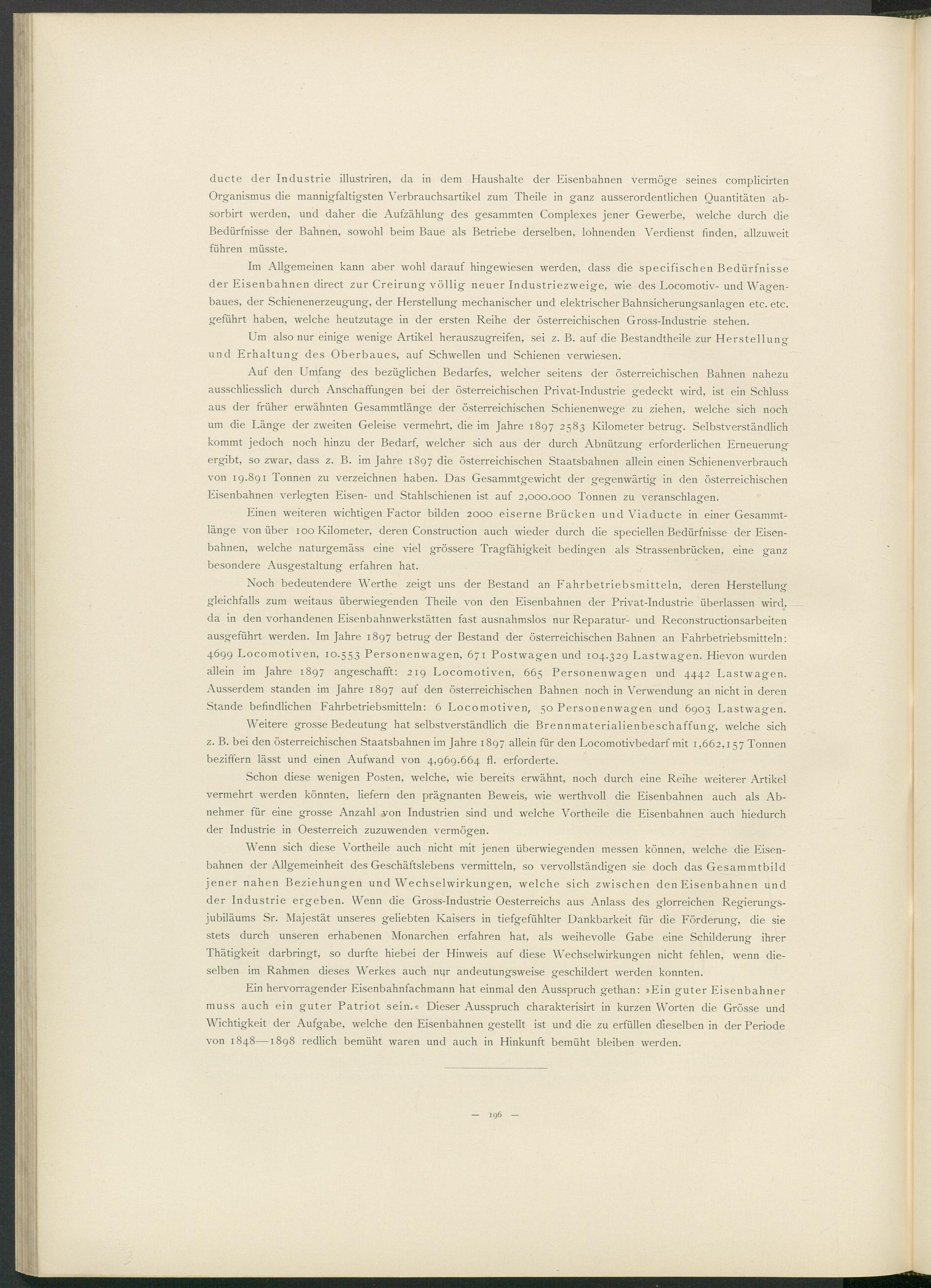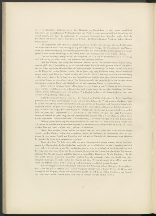 Wenn sich diese Vortheile auch nicht mit jenen überwiegenden messen können, welche die Eisenbahnen der Allgemeinheit des Geschäftslebens vermitteln, so vervollständigen sie doch das Gesammtbild jener nahen Beziehungen und Wechselwirkungen, welche sich zwischen den Eisenbahnen und der Industrie ergeben. Wenn die Gross-Industrie Oesterreichs aus Anlass des glorreichen Regierungsjubiläums Sr. Majestät unseres geliebten Kaisers in tiefgefühlter Dankbarkeit für die Förderung, die sie stets durch unseren erhabenen Monarchen erfahren hat, als weihevolle Gabe eine Schilderung ihrer Thätigkeit darbringt, so durfte hiebei der Hinweis auf diese Wechselwirkungen nicht fehlen, wenn dieselben im Rahmen dieses Werkes auch nur andeutungsweise geschildert werden konnten.