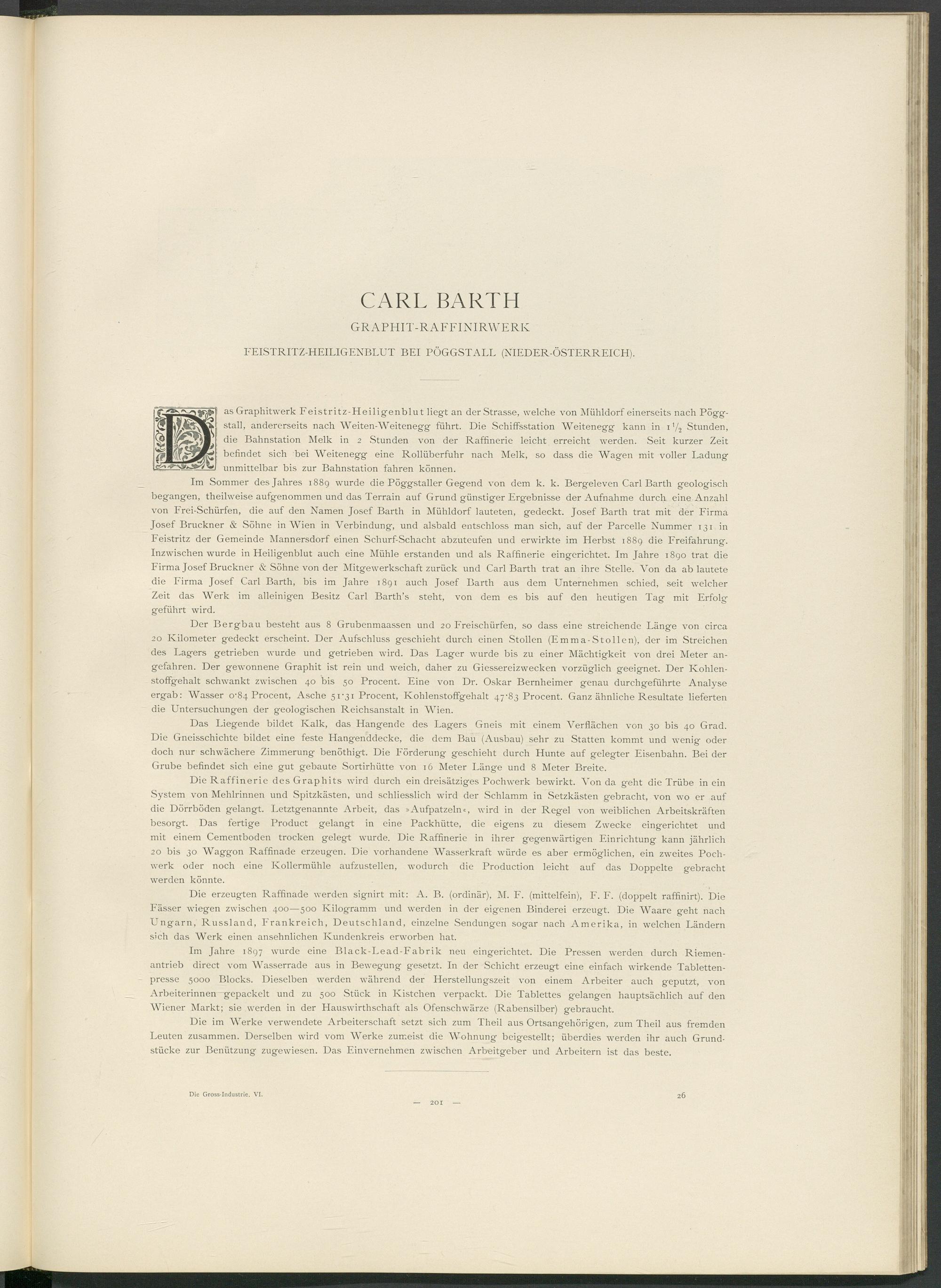 Der Bergbau besteht aus 8 Grubenmaassen und 20 Freischürfen, so dass eine streichende Länge von circa 20 Kilometer gedeckt erscheint. Der Aufschluss geschieht durch einen Stollen (Emma-St ollen), der im Streichen des Lagers getrieben wurde und getrieben wird. Das Lager wurde bis zu einer Mächtigkeit von drei Meter angefahren. Der gewonnene Graphit ist rein und weich, daher zu Giessereizvvecken vorzüglich geeignet. Der Kohlenstoffgehalt schwankt zwischen 40 bis 50 Procent. Eine von Dr. Oskar Bernheimer genau durchgeführte Analyse ergab: Wasser 0-84 Procent, Asche 51-31 Procent, Ivohlenstoffgehalt 47-83 Procent. Ganz ähnliche Resultate lieferten die Untersuchungen der geologischen Reichsanstalt in Wien.
