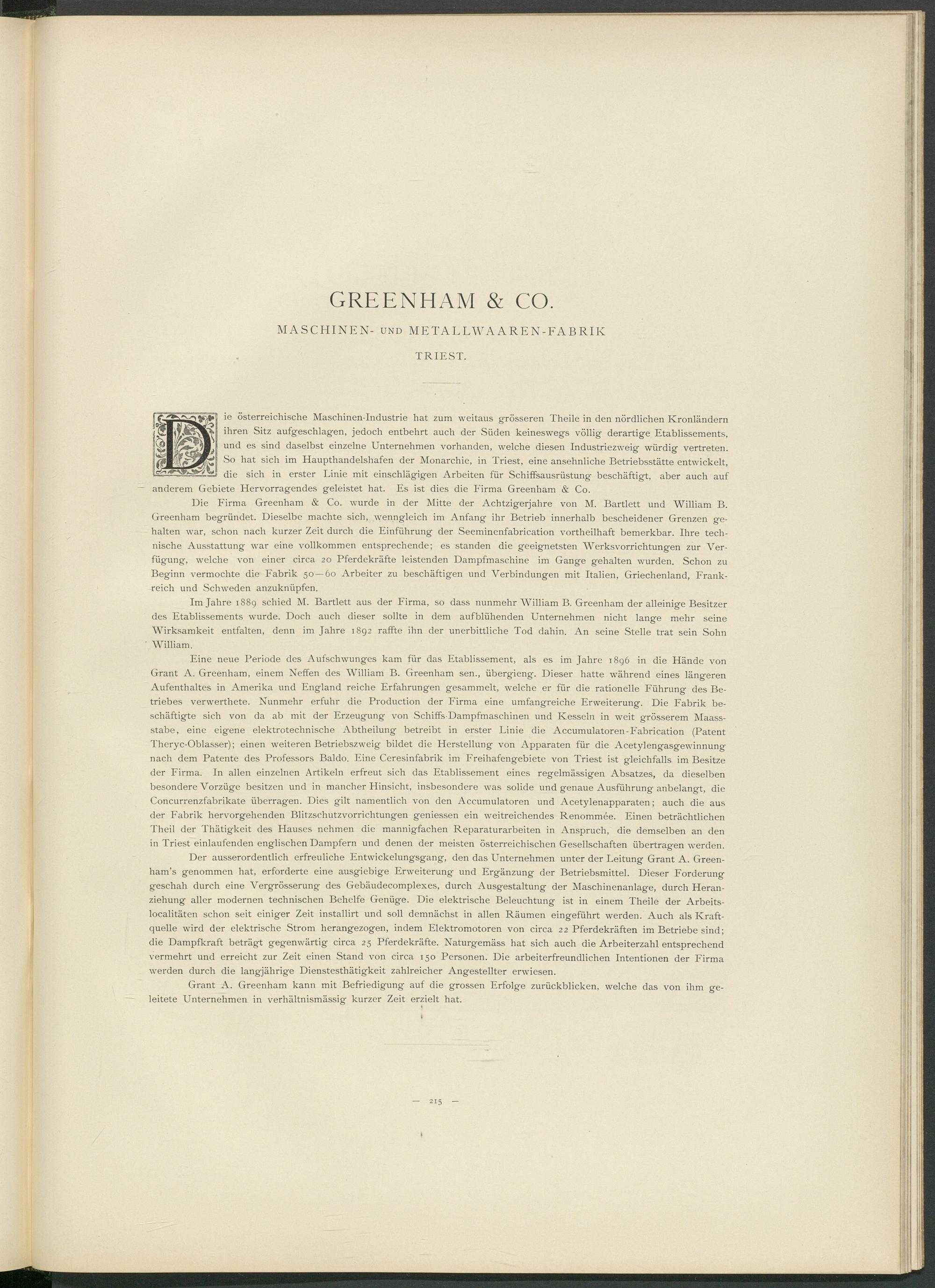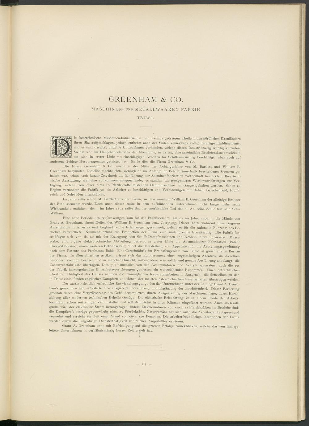 Eine neue Periode des Aufschwunges kam für das Etablissement, als es im Jahre 1896 in die Hände von Grant A. Greenham, einem Neffen des William B. Greenham sen., übergieng-. Dieser hatte w'ährend eines längeren Aufenthaltes in Amerika und England reiche Erfahrungen gesammelt, welche er für die rationelle Führung des Betriebes verwerthete. Nunmehr erfuhr die Production der Firma eine umfangreiche Erweiterung. Die Fabrik beschäftigte sich von da ab mit der Erzeugung von Schiffs-Dampfmaschinen und Kesseln in weit grösserem Maassstabe, eine eigene elektrotechnische Abtheilung betreibt in erster Linie die Accumulatoren-Fabrication (Patent Theryc-Oblasser); einen weiteren Betriebszweig bildet die Herstellung von Apparaten für die Acetylengasgewinnung nach dem Patente des Professors Baldo. Eine Ceresinfabrik im Freihafengebiete von Triest ist gleichfalls im Besitze der Firma. In allen einzelnen Artikeln erfreut sich das Etablissement eines regelmässigen Absatzes, da dieselben besondere Vorzüge besitzen und in mancher Hinsicht, insbesondere w 7 as solide und genaue Ausführung anbelangt, die Concurrenzfabrikate überragen. Dies gilt namentlich von den Accumulatoren und Acetylenapparaten; auch die aus der Fabrik hervorgehenden Blitzschutzvorrichtungen geniessen ein weitreichendes Renommée. Einen beträchtlichen Theil der Thätigkeit des Hauses nehmen die mannigfachen Reparaturarbeiten in Anspruch, die demselben an den in Triest einlaufenden englischen Dampfern und denen der meisten österreichischen Gesellschaften übertragen werden.