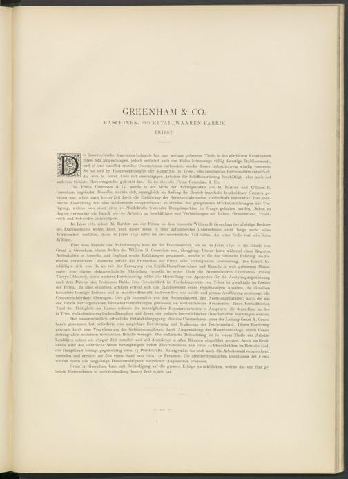 ie österreichische Maschinen-Industrie hat zum weitaus grösseren Theile in den nördlichen Kronländern ihren Sitz aufgeschlagen, jedoch entbehrt auch der Süden keineswegs völlig derartige Etablissements, und es sind daselbst einzelne Unternehmen vorhanden, welche diesen Industriezweig würdig vertreten. So hat sich im Haupthandelshafen der Monarchie, in Triest, eine ansehnliche Betriebsstätte entwickelt, die sich in erster Linie mit einschlägigen Arbeiten für Schiffsausrüstung beschäftigt, aber auch auf anderem Gebiete Hervorragendes geleistet hat. Es ist dies die Firma Greenham & Co.