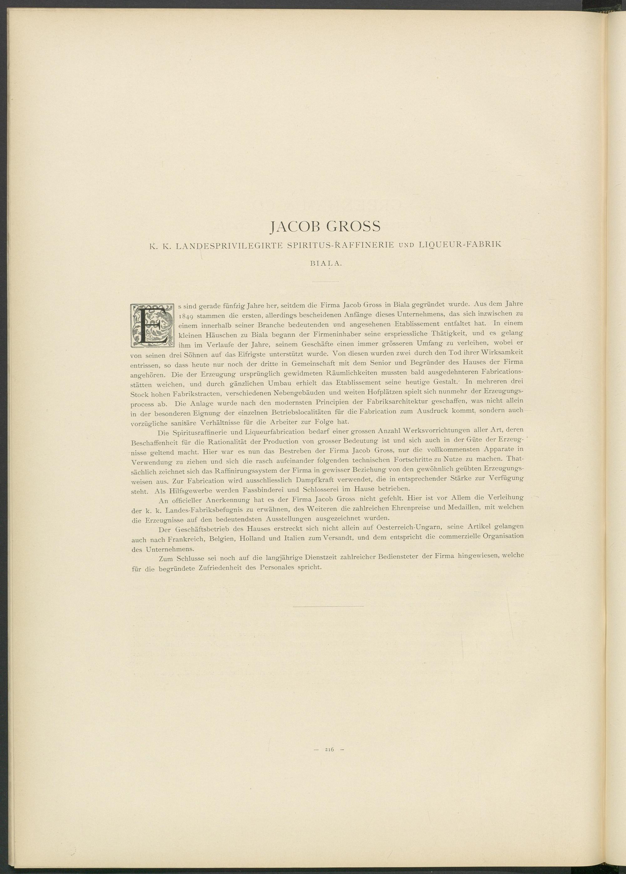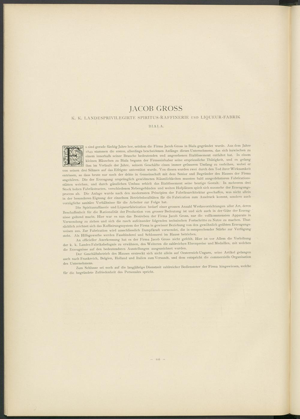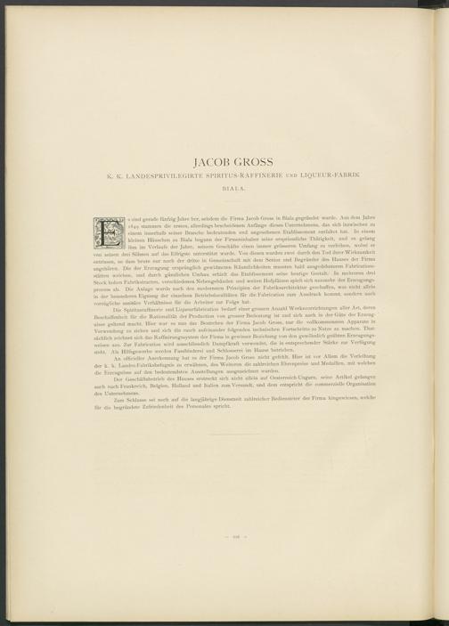 Die Spiritusraffinerie und Liqueurfabrication bedarf einer grossen Anzahl Werksvorrichtungen aller Art, deren Beschaffenheit für die Rationalität der Production von grosser Bedeutung ist und sich auch in der Güte der Erzeugnisse geltend macht. Hier war es nun das Bestreben der Firma Jacob Gross, nur die vollkommensten Apparate in Verwendung zu ziehen und sich die rasch aufeinander folgenden technischen Fortschritte zu Nutze zu machen. That- sächlich zeichnet sich das Raffinirungssystem der Firma in gewisser Beziehung von den gewöhnlich geübten Erzeugungsweisen aus. Zur Fabrication wird ausschliesslich Dampf kraft verwendet, die in entsprechender Stärke zur Verfügung steht. Als Hilfsgewerbe werden Fassbinderei und Schlosserei im Hause betrieben.