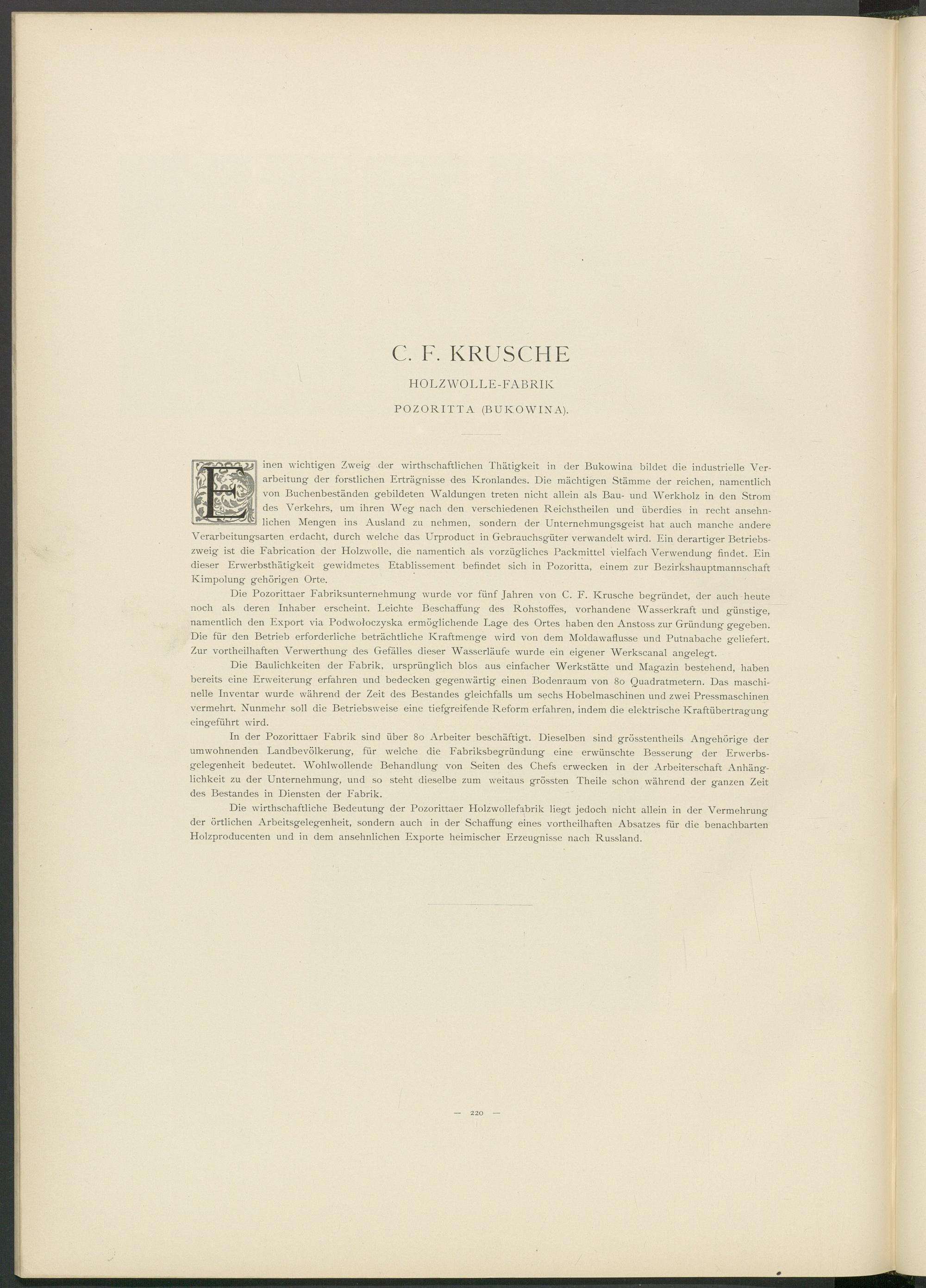 Die Pozorittaer Fabriksunternehmung wurde vor fünf Jahren von C. F. Krusche begründet, der auch heute noch als deren Inhaber erscheint. Leichte Beschaffung des Rohstoffes, vorhandene Wasserkraft und günstige, namentlich den Export via Podwoloczyska ermöglichende Lage des Ortes haben den Anstoss zur Gründung gegeben. Die für den Betrieb erforderliche beträchtliche Kraftmenge wird von dem Moldawaflusse und Putnabache geliefert. Zur vortheilhaften Verwerthung des Gefälles dieser Wasserläufe wurde ein eigener Werkscanal angelegt.