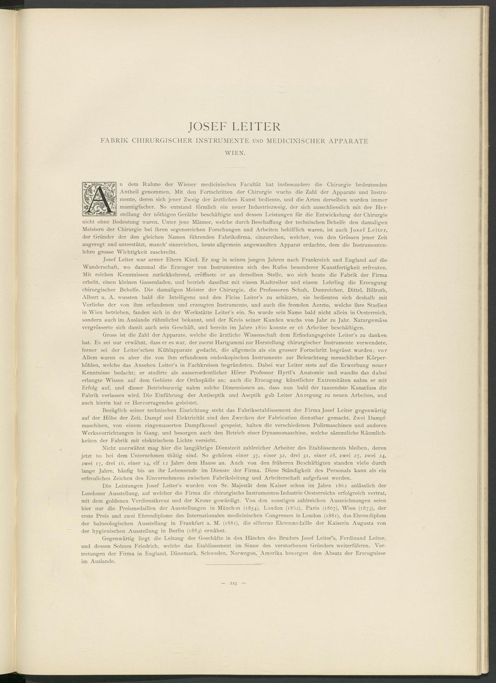 n dem Ruhme der Wiener medicinischen Facultät hat insbesondere die Chirurgie bedeutenden Antheil genommen. Mit den Fortschritten der Chirurgie wuchs die Zahl der Apparate und Instrumente, deren sich jener Zweig der ärztlichen Kunst bediente, und die Arten derselben wurden immer mannigfacher. So entstand förmlich ein neuer Industriezweig, der sich ausschliesslich mit der Herstellung der nöthigen Geräthe beschäftigte und dessen Leistungen für die Entwickelung der Chirurgie nicht ohne Bedeutung waren. Unter jene Männer, welche durch Beschaffung der technischen Behelfe den damaligen Meistern der Chirurgie bei ihren segensreichen Forschungen und Arbeiten behilflich waren, ist auch Josef Leiter, der Gründer der den gleichen Namen führenden Fabriksfirma, einzureihen, welcher, von den Grössen jener Zeit angeregt und unterstützt, manch’ sinnreichen, heute allgemein angewandten Apparat erdachte, dem die Instrumentenlehre grosse Wichtigkeit zuschreibt.