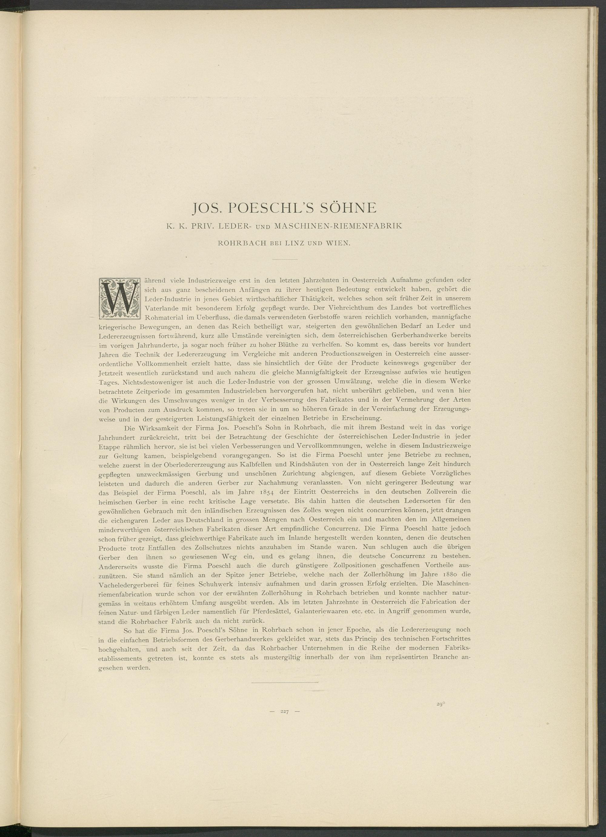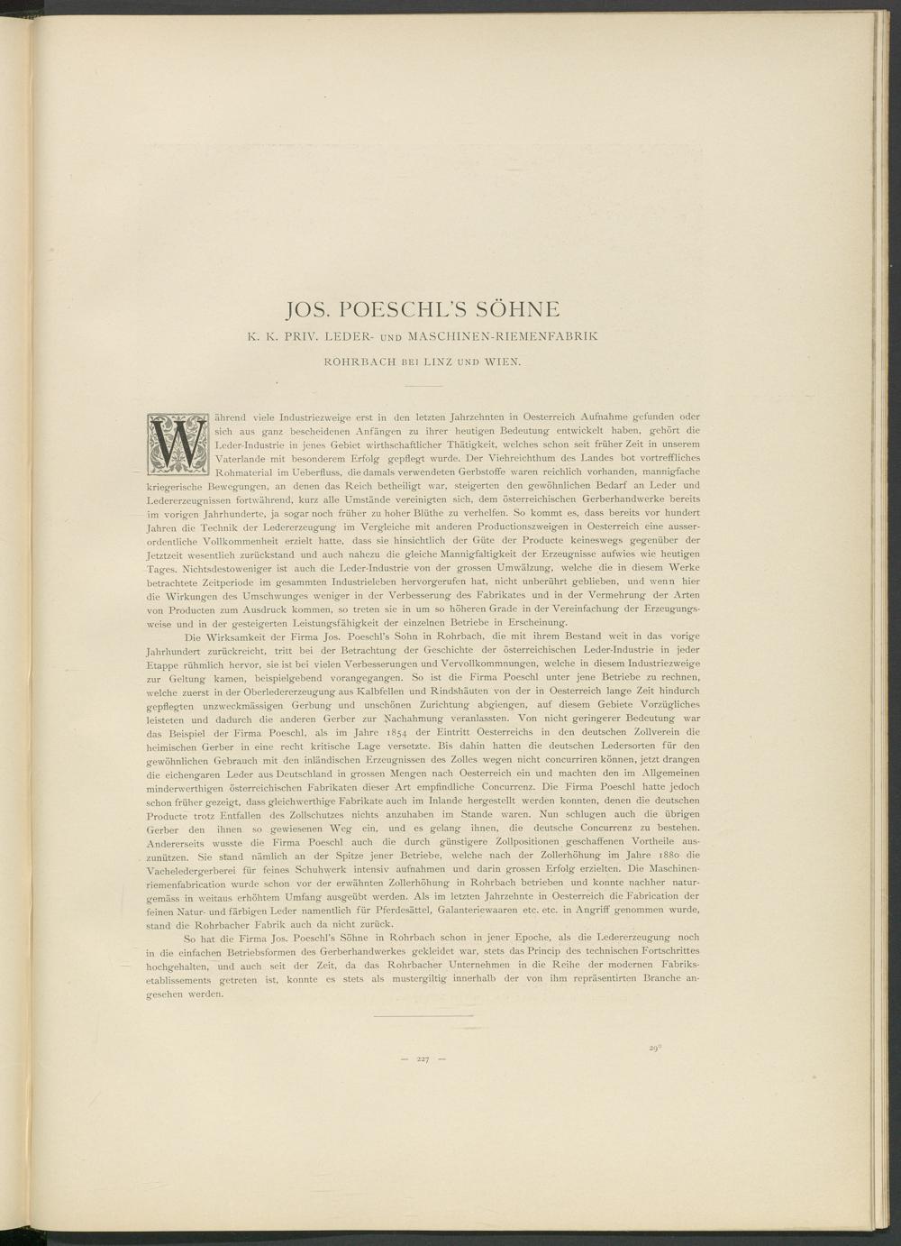 Die Wirksamkeit der Firma Jos. Poeschl’s Sohn in Rohrbach, die mit ihrem Bestand weit in das vorige Jahrhundert zurückreicht, tritt bei der Betrachtung der Geschichte der österreichischen Leder-Industrie in jeder Etappe rühmlich hervor, sie ist bei vielen Verbesserungen und Vervollkommnungen, welche in diesem Industriezweige zur Geltung kamen, beispielgebend vorangegangen. So ist die Firma Poeschl unter jene Betriebe zu rechnen, welche zuerst in der Oberledererzeugung aus Kalbfellen und Rindshäuten von der in Oesterreich lange Zeit hindurch gepflegten unzweckmässigen Gerbung und unschönen Zurichtung abgiengen, auf diesem Gebiete Vorzügliches leisteten und dadurch die anderen Gerber zur Nachahmung veranlassten. Von nicht geringerer Bedeutung war das Beispiel der Firma Poeschl, als im Jahre 1854 der Eintritt Oesterreichs in den deutschen Zollverein die heimischen Gerber in eine recht kritische Lage versetzte. Bis dahin hatten die deutschen Ledersorten für den gewöhnlichen Gebrauch mit den inländischen Erzeugnissen des Zolles wegen nicht concurriren können, jetzt drangen die eichengaren Leder aus Deutschland in grossen Mengen nach Oesterreich ein und machten den im Allgemeinen minderwerthigen österreichischen Fabrikaten dieser Art empfindliche Concurrenz. Die Firma Poeschl hatte jedoch schon früher gezeigt, dass gleichwerthige Fabrikate auch im Inlande hergestellt werden konnten, denen die deutschen Producte trotz Entfallen des Zollschutzes nichts anzuhaben im Stande waren. Nun schlugen auch die übrigen Gerber den ihnen so gewiesenen Weg ein, und es gelang ihnen, die deutsche Concurrenz zu bestehen. Andererseits wusste die Firma Poeschl auch die durch günstigere Zollpositionen geschaffenen Vortheile auszunützen. Sie stand nämlich an der Spitze jener Betriebe, welche nach der Zollerhöhung im Jahre 1880 die Vacheledergerberei für feines Schuhwerk intensiv aufnahmen und darin grossen Erfolg erzielten. Die Maschinen- riemenfabrication wurde schon vor der erwähnten Zollerhöhung in Rohrbach betrieben und konnte nachher natur- gemäss in weitaus erhöhtem Umfang ausgeübt werden. Als im letzten Jahrzehnte in Oesterreich die Fabrication der feinen Natur- und farbigen Leder namentlich für Pferdesättel, Galanteriewaaren etc. etc. in Angriff genommen wurde, stand die Rohrbacher Fabrik auch da nicht zurück.
