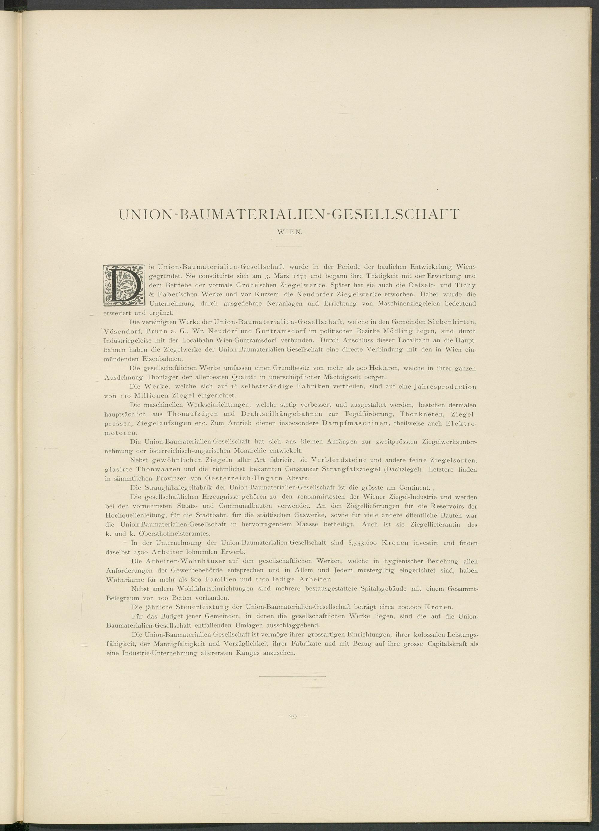 ie Union-Baumaterialien-Gesellschaft wurde in der Periode der baulichen Entwickelung Wiens Ö4 gegründet. Sie constituirte sich am 3. März 1873 und begann ihre Thätigkeit mit der Erwerbung und dem Betriebe der vormals Grohe’schen Ziegelwerke. Später hat sie auch die Oelzelt- und Tichy & Eaber’schen Werke und vor Kurzem die Neudorfer Ziegelwerke erworben. Dabei wurde die Unternehmung durch ausgedehnte Neuanlagen und Errichtung von Maschinenziegeleien bedeutend erweitert und ergänzt.