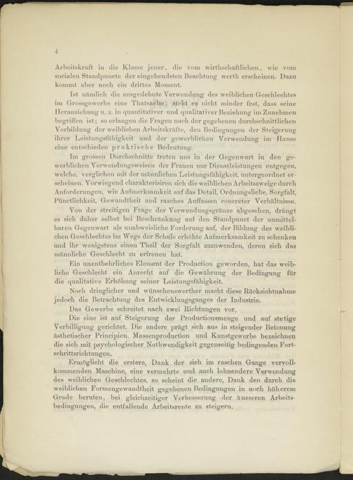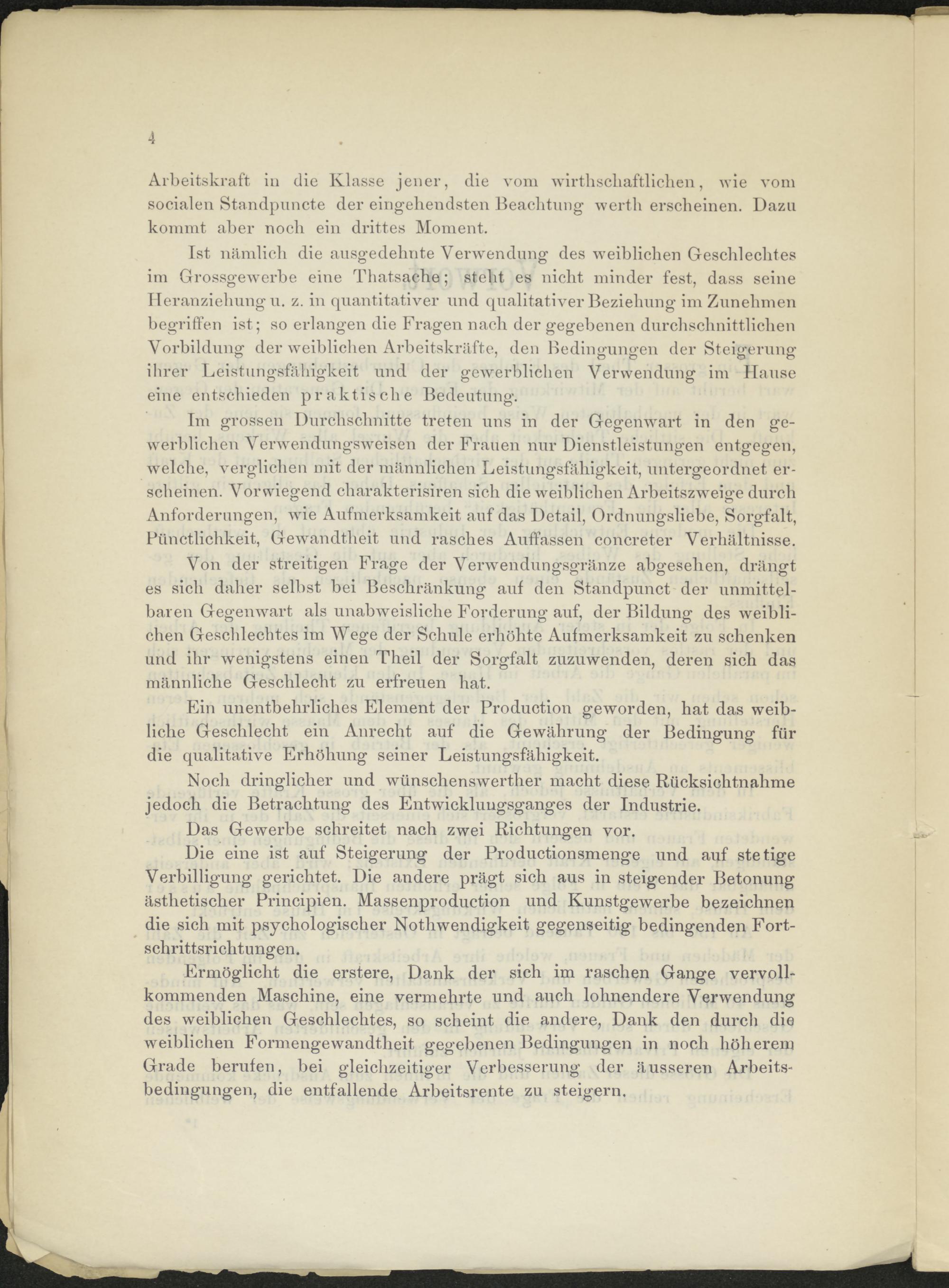 Ist nämlich die ausgedehnte Verwendung des weiblichen Geschlechtes im Grossgewerbe eine Thatsache; steht es nicht minder fest, dass seine Heranziehung u. z. in quantitativer und qualitativer Beziehung im Zunehmen begriffen ist; so erlangen die Fragen nach der gegebenen durchschnittlichen Vorbildung der weiblichen Arbeitskräfte, den Bedingungen der Steigerung