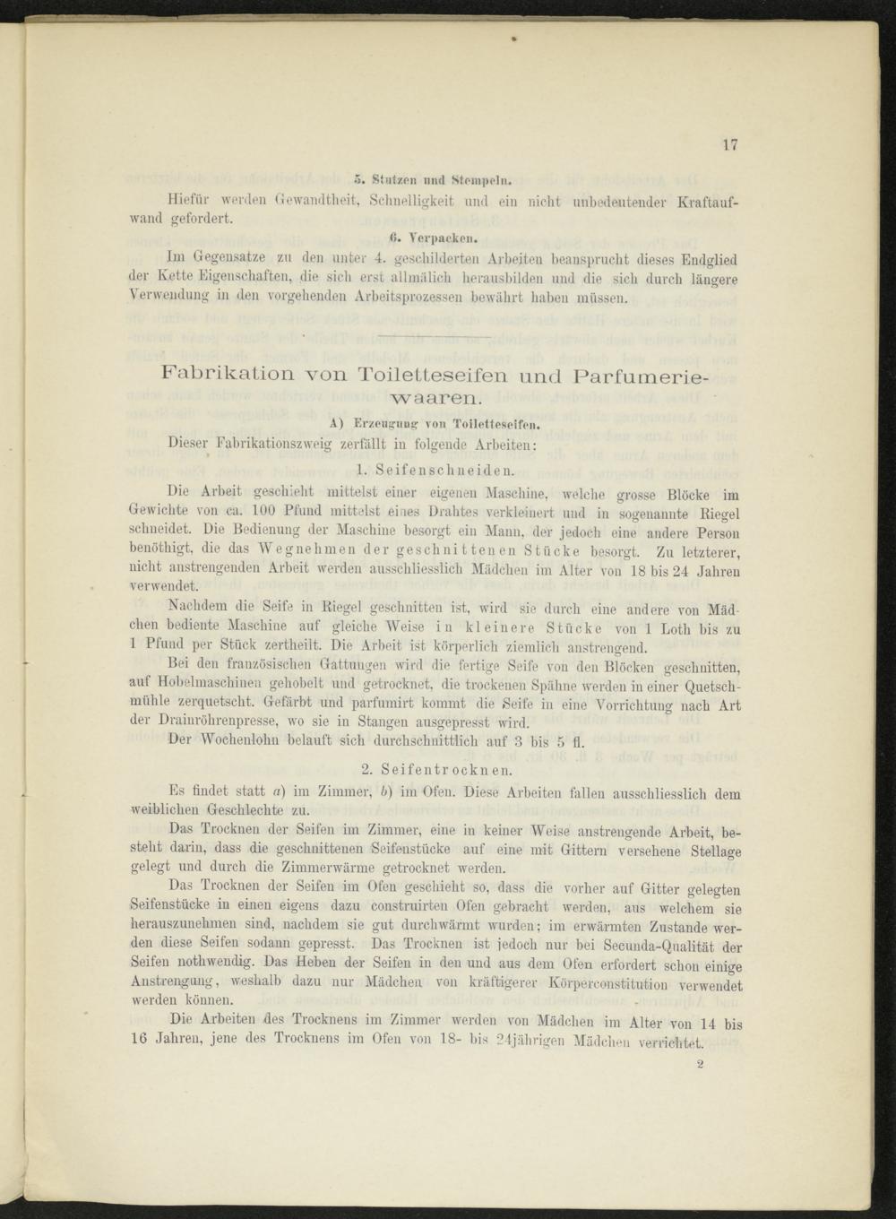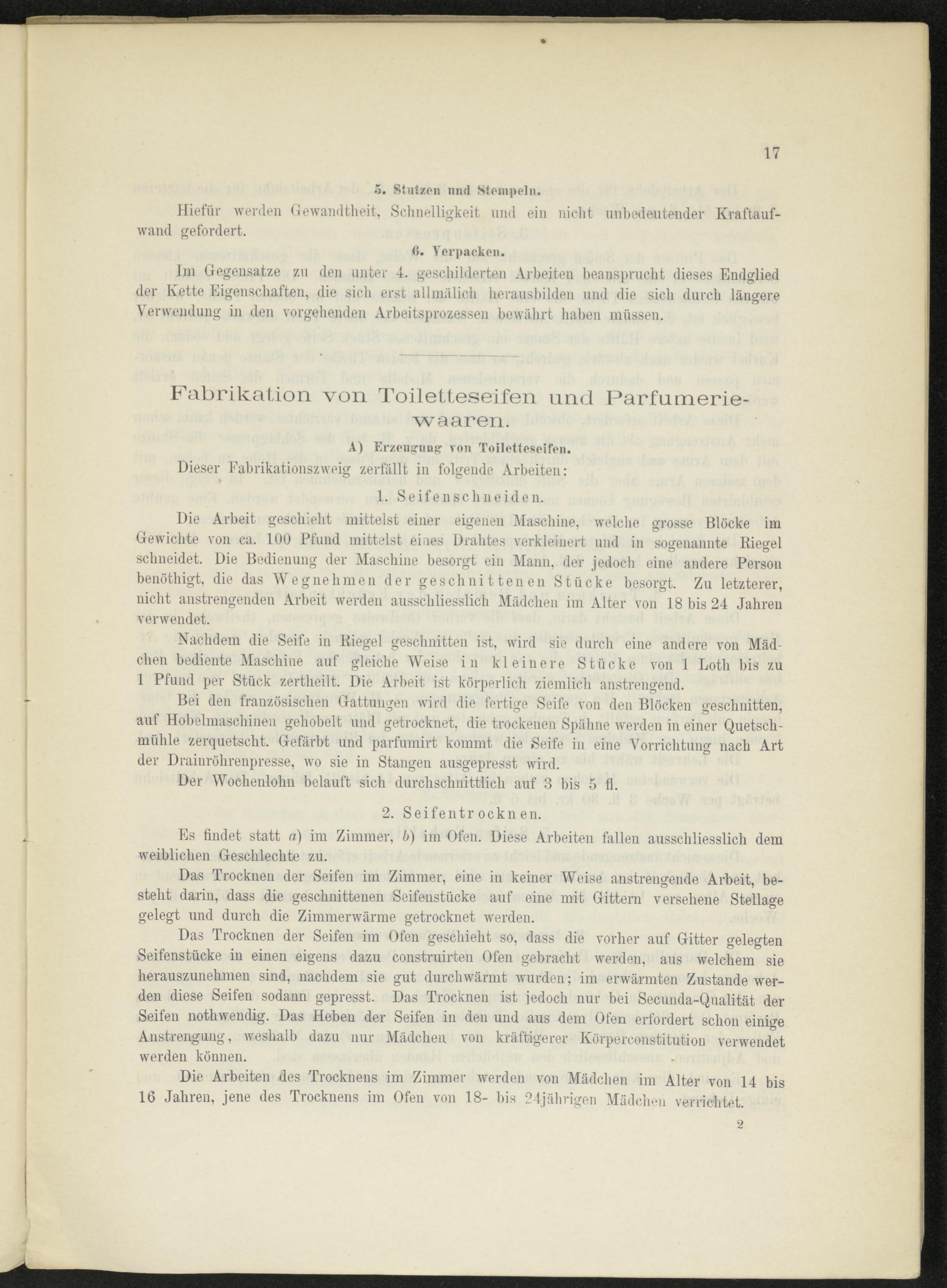 Das Trocknen der Seifen im Ofen geschieht so, dass die vorher auf Gitter gelegten Seifenstücke in einen eigens dazu construirten Ofen gebracht werden, aus welchem sie herauszunehmen sind, nachdem sie gut durchwärmt wurden; im erwärmten Zustande werden diese Seifen sodann gepresst. Das Trocknen ist jedoch nur bei Secunda-Qualität der Seifen nothwendig. Das Heben der Seifen in den und aus dem Ofen erfordert schon einige Anstrengung, weshalb dazu nur Mädchen von kräftigerer Körperconstitution verwendet werden können.
