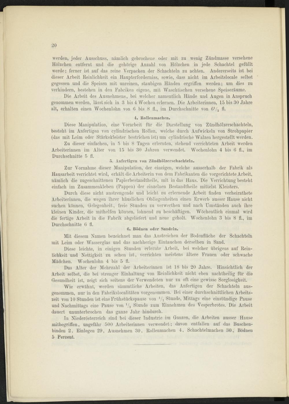 Tn Niederösterreich sind bei dieser Industrie im Ganzen, die Arbeiten ausser Hanse mitbegriffen, ungefähr 500 Arbeiterinnen verwendet; davon entfallen auf das Buschenbinden 2, Einlegen 29, Ausnehmen 30, Rollenmachen 4, Schachtelmachen 30, Bödnen 5 Percent.