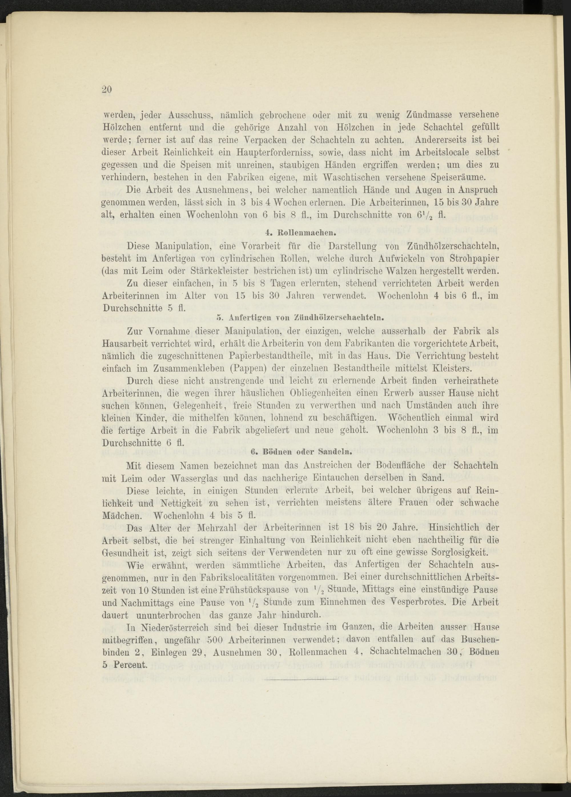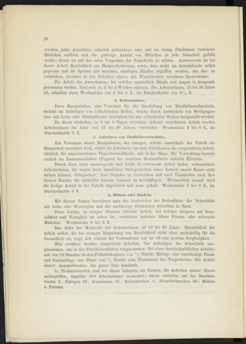 Zu dieser einfachen, in 5 bis 8 Tagen erlernten, stehend verrichteten Arbeit werden Arbeiterinnen im Alter von 15 bis 30 Jahren verwendet. Wochenlohn 4 bis 6 fl., im Durchschnitte 5 fl.