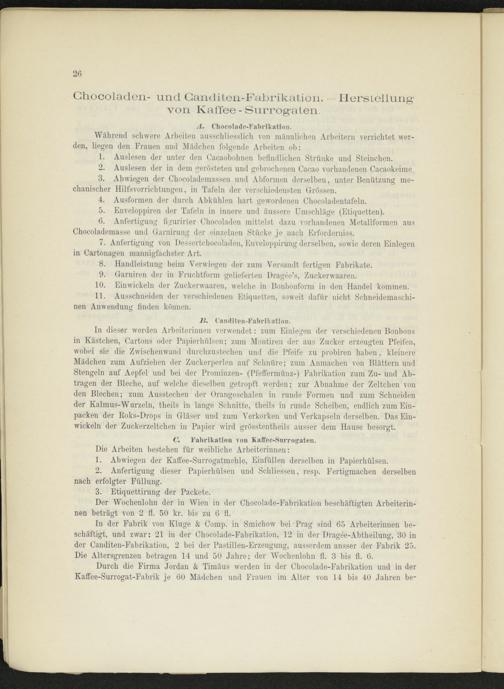 In der Fabrik von Kluge & Comp, in Smichow bei Prag sind 65 Arbeiterinnen beschäftigt, und zwar: 21 in der Chocolade-Fabrikation, 12 in der Dragee-Abtheilung, 30 in der Canditen-Fabrikation, 2 bei der Pastillen-Erzeugung, ausserdem ausser der Fabrik 25. Die Altersgrenzen betragen 14 und 50 Jahre; der Wochenlohn fl. 3 bis fl. 6.