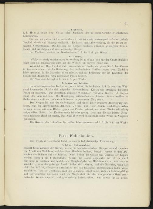 Während der Hand web stuhl, namentlich der breite, die ganze Kraft des Mannes in Anspruch nimmt, ist die Bedienung des mechanischen Stuhles schon dem Mädchen leicht gemacht, da die Maschine allein arbeitet und die Bedienung nur im Einsetzen der Spulen und Anknüpfen etwa zerrissener Fäden besteht.