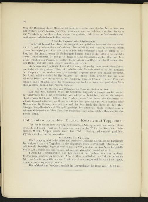 Auch hiezu sind Geschicklichkeit und Erfahrung nothwendig, denn verschiedene Nebenumstände, wie ein gewisser Hitzegrad, unbedeutende Verschiedenheiten in der Dichtheit der Kappen u. s. w. machen eine gleichmässige Appretur mehr oder minder schwierig. Die Arbeit selbst erfordert kräftige Naturen, die grosse Hitze ertragen und mit dem schweren Deckel gleichzeitig schnell und vorsichtig umgehen können. Da der Fess zwischen 3 und 5 Minuten unter der Schraubenpresse bleibt, so kann ein geschicktes Mädchen 3 solche Formen und Pressen bedienen.