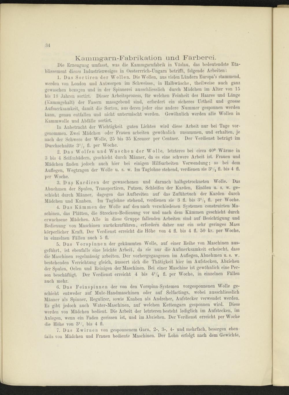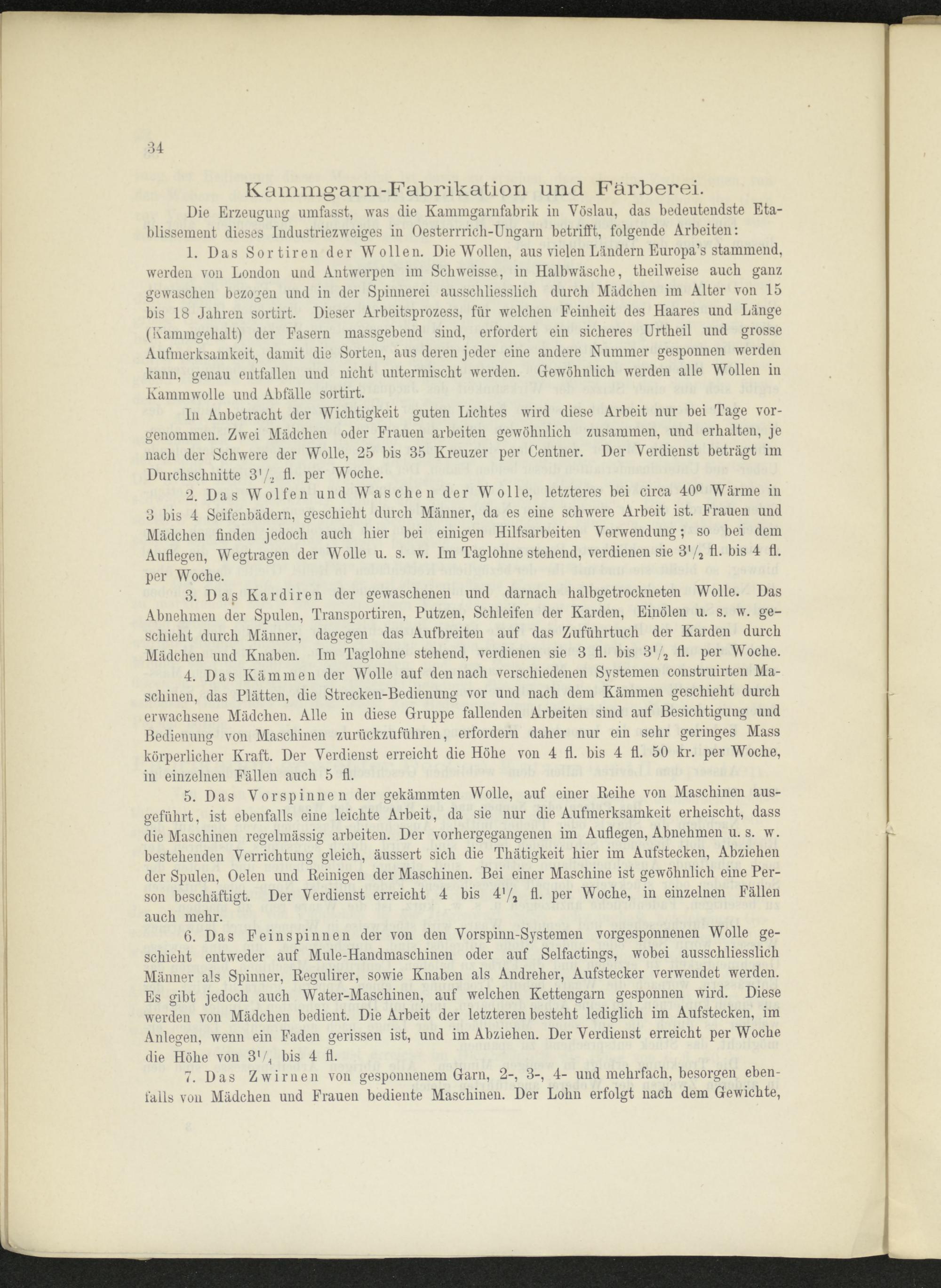 4. Das Kämmen der Wolle auf den nach verschiedenen Systemen construirten Maschinen, das Plätten, die Strecken-Bedienung vor und nach dem Kämmen geschieht durch erwachsene Mädchen. Alle in diese Gruppe fallenden Arbeiten sind auf Besichtigung und Bedienung von Maschinen zurückzuführen, erfordern daher nur ein sehr geringes Mass körperlicher Kraft. Der Verdienst erreicht die Höhe von 4 fl. bis 4 fl. 50 kr. per Woche, in einzelnen Fällen auch 5 fl.