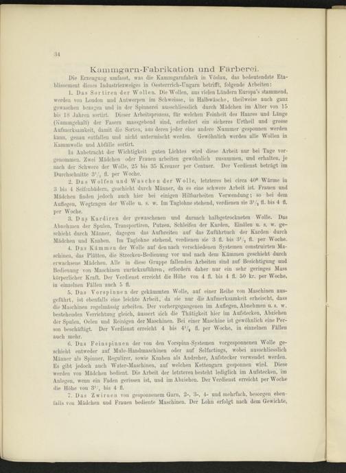2. Das Wolfen und Waschen der Wolle, letzteres bei circa 40° Wärme in 3 bis 4 Seifenbädern, geschieht durch Männer, da es eine schwere Arbeit ist. Frauen und Mädchen finden jedoch auch hier bei einigen Hilfsarbeiten Verwendung; so bei dem Auflegen, Wegtragen der Wolle u. s. w. Im Taglohne stehend, verdienen sie 3'/ 2 fl. bis 4 fl. per Woche.