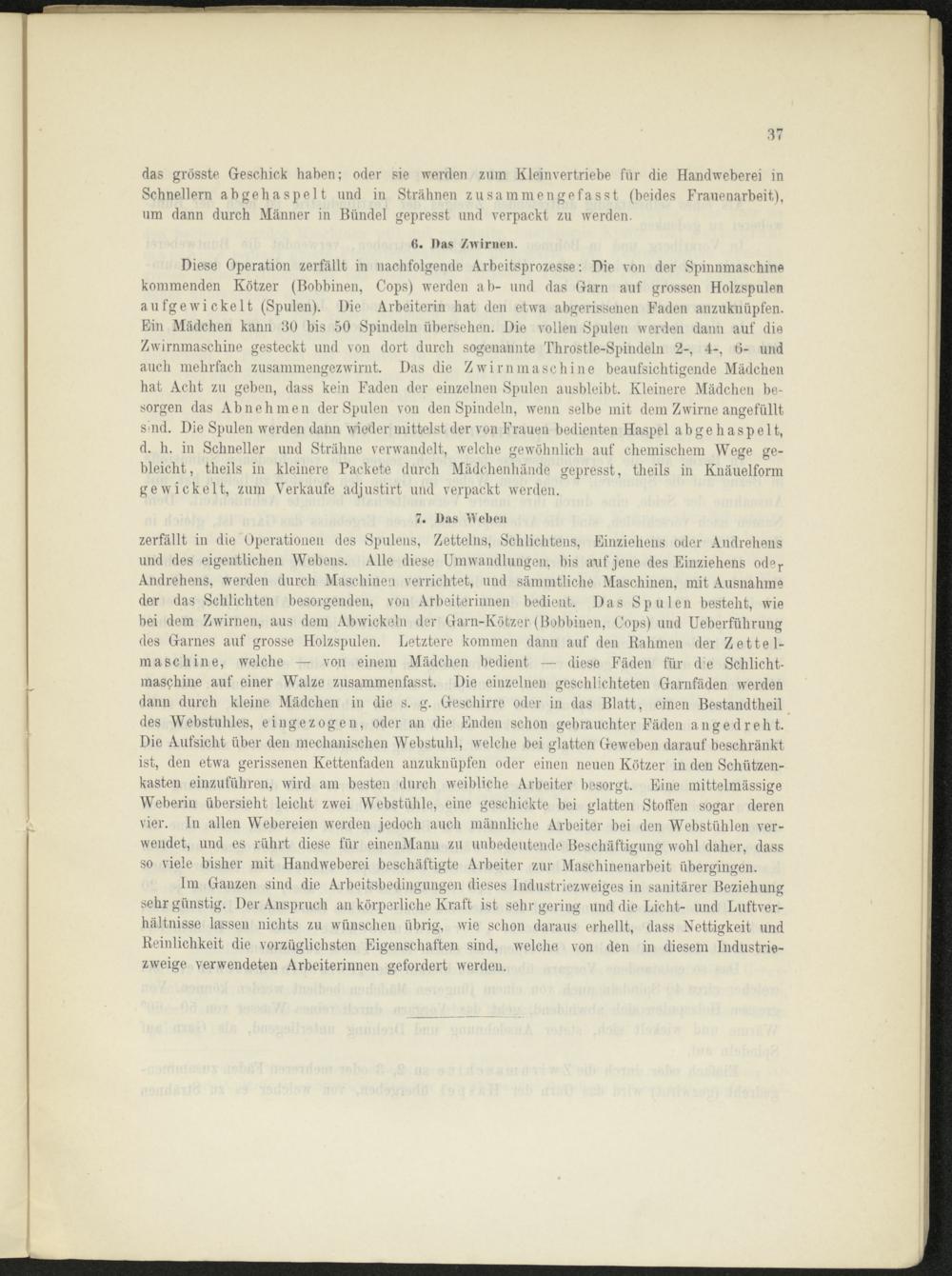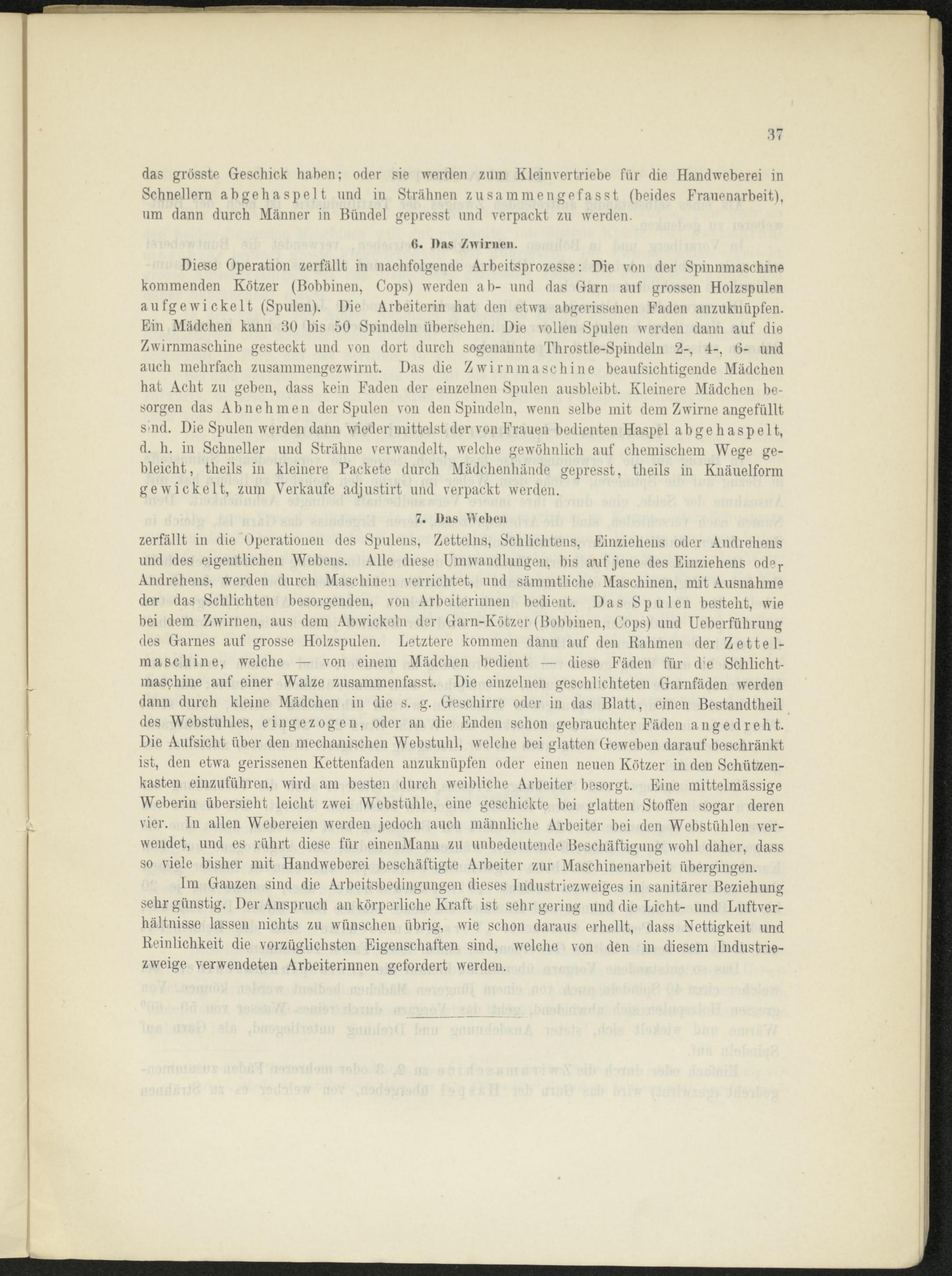 Diese Operation zerfällt in nachfolgende Arbeitsprozesse: Die von der Spinnmaschine kommenden Kötzer (Bobbinen, Cops) werden ab- und das Garn auf grossen Holzspulen aufgewickelt (Spulen). Die Arbeiterin hat den etwa abgerissenen Faden anzuknüpfen. Ein Mädchen kann 30 bis 50 Spindeln übersehen. Die vollen Spulen werden dann auf die Zwirnmaschine gesteckt und von dort durch sogenannte Throstle-Spindeln 2-, 4-, 0- und auch mehrfach zusammengezwirnt. Das die Z wir n in aschine beaufsichtigende Mädchen hat Acht zu geben, dass kein Faden der einzelnen Spulen ausbleibt. Kleinere Mädchen besorgen das Abnehmen der Spulen von den Spindeln, wenn selbe mit dem Zwirne angefüllt smd. Die Spulen werden dann wieder mittelst der von Frauen bedienten Haspel abgehaspelt, d. h. in Schneller und Strähne verwandelt, welche gewöhnlich auf chemischem Wege gebleicht, theils in kleinere Packete durch Mädchenhände gepresst, theils in Knäuelform gewickelt, zum Verkaufe adjustirt und verpackt werden.