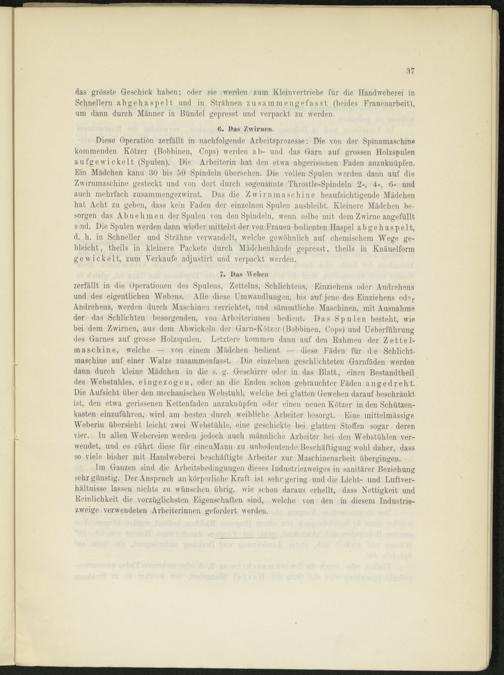 Im Ganzen sind die Arbeitsbedingungen dieses Industriezweiges in sanitärer Beziehung sehr günstig. Der Anspruch an körperliche Kraft ist sehr gering und die Licht- und Luftverhältnisse lassen nichts zu wünschen übrig, wie schon daraus erhellt, dass Nettigkeit und Keinlichkeit die vorzüglichsten Eigenschaften sind, welche von den in diesem Industriezweige verwendeten Arbeiterinnen gefordert werden.