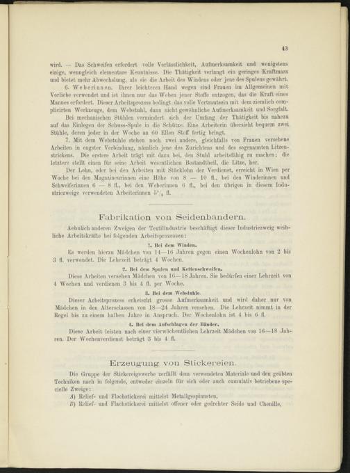 Der Lohn, oder bei den Arbeiten mit Stücklohn der Verdienst, erreicht in Wien per Woche bei den Magazineurinnen eine Höhe von 8 — 10 fl., bei den Winderinnen und Schweiferinnen (5 — 8 11., bei den AVeberinnen (5 11., bei den übrigen in diesem Industriezweige verwendeten Arbeiterinnen 5'/ 2 fl.