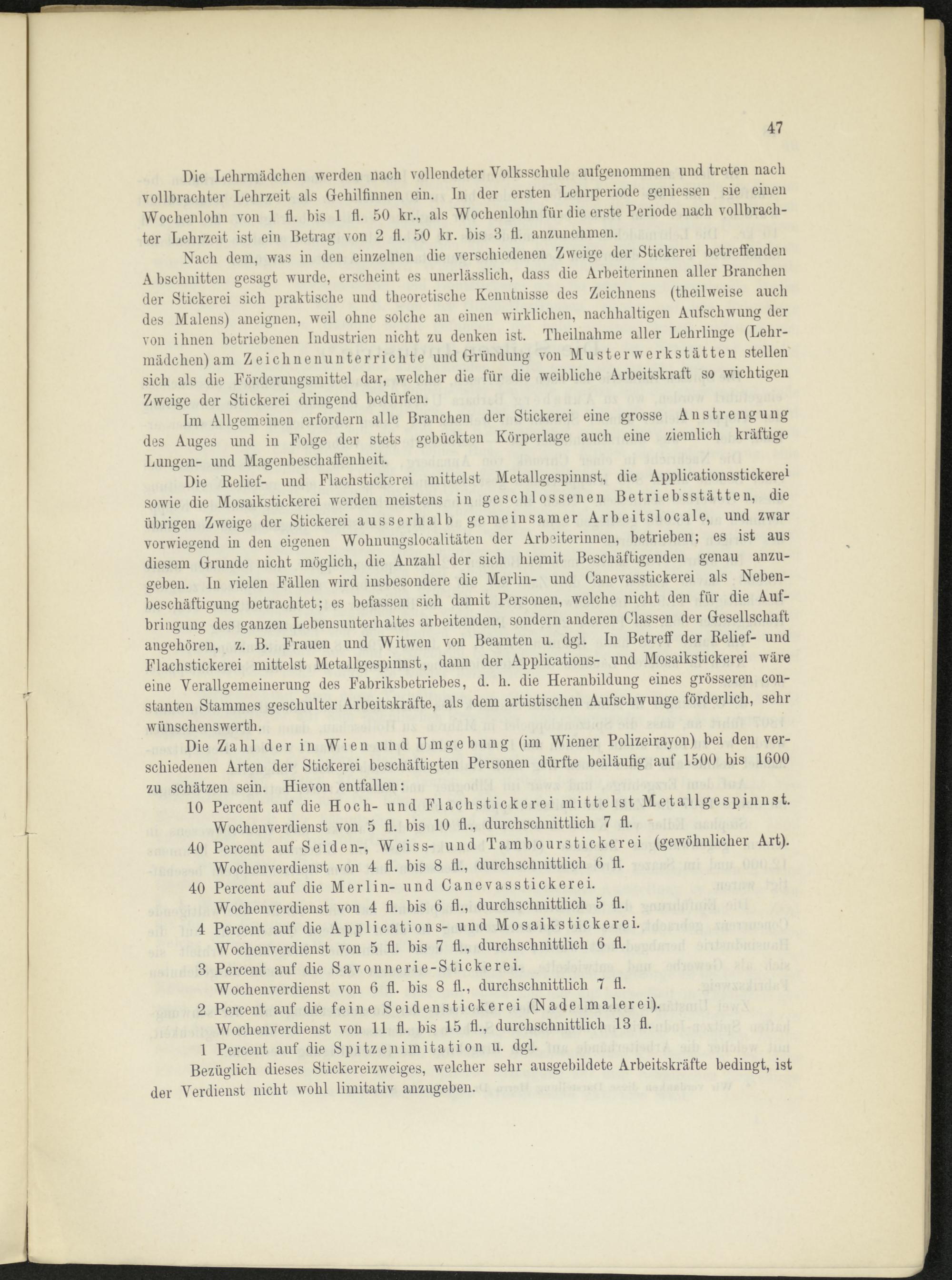 Die Relief- und Flachstickerei mittelst Metallgespinnst, die Applicationsstickere 1 sowie die Mosaikstickerei werden meistens in geschlossenen Betriebsstätten, die übrigen Zweige der Stickerei ausserhalb gemeinsamer Arbeitslocale, und zwar vorwiegend in den eigenen Wohnungslocalitäten der Arbeiterinnen, betrieben; es ist aus diesem Grunde nicht möglich, die Anzahl der sich hiemit Beschäftigenden genau anzugeben. In vielen Fällen wird insbesondere die Merlin- und Canevasstickerei als Nebenbeschäftigung betrachtet; es befassen sich damit Personen, welche nicht den für die Aufbringung des ganzen Lebensunterhaltes arbeitenden, sondern anderen Classen der Gesellschaft angehören, z. B. Frauen und Witwen von Beamten u. dgl. In Betreff der Relief- und Flachstickerei mittelst Metallgespinnst, dann der Applications- und Mosaikstickerei wäre eine Verallgemeinerung des Fabriksbetriebes, d. h. die Heranbildung eines grösseren con- stanten Stammes geschulter Arbeitskräfte, als dem artistischen Aufschwünge förderlich, sehr wünschenswerth.