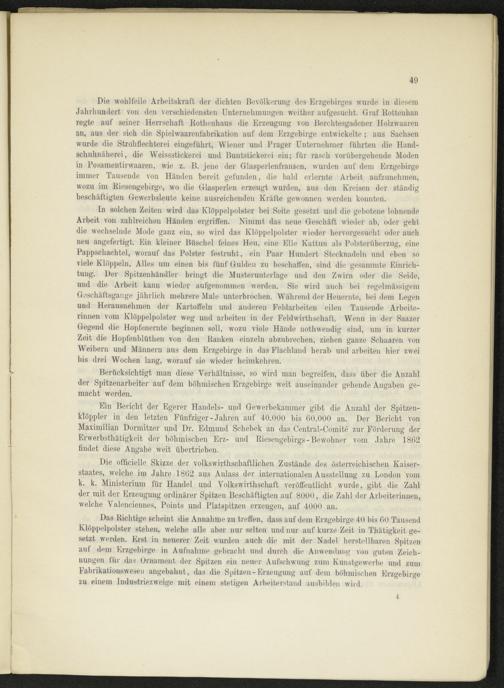 Das Richtige scheint die Annahme zu treffen, dass auf dem Erzgebirge 40 bis 60 Tausend Klöppelpolster stehen, welche alle aber nur selten und nur auf kurze Zeit in Thätigkeit gesetzt werden. Erst in neuerer Zeit wurden auch die mit der Nadel herstellbaren Spitzen auf dem Erzgebirge in Aufnahme gebracht und durch die Anwendung von guten Zeichnungen für das Ornament der Spitzen ein neuer Aufschwung zum Kunstgewerbe und zum Fabrikationswesen angebahnt, das die Spitzen-Erzeugung auf dem böhmischen Erzgebirge zu einem Industriezweige mit einem stetigen Arbeiterstand ausbilden wird.