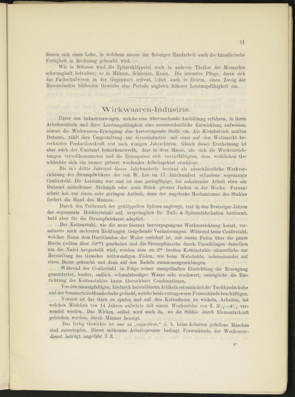 Wie in Böhmen wird die Spitzenklöppelei noch in anderen Theilen der Monarchie schwunghaft betrieben; so in Mähren, Schlesien, Kraiu. Die intensive Pflege, deren sich das Fachschulwesen in der Gegenwart erfreut, leitet auch in diesem, einen Zweig der Hausindustrie bildenden Gewerbe eine Periode ungleich höherer Leistungsfähigkeit ein.