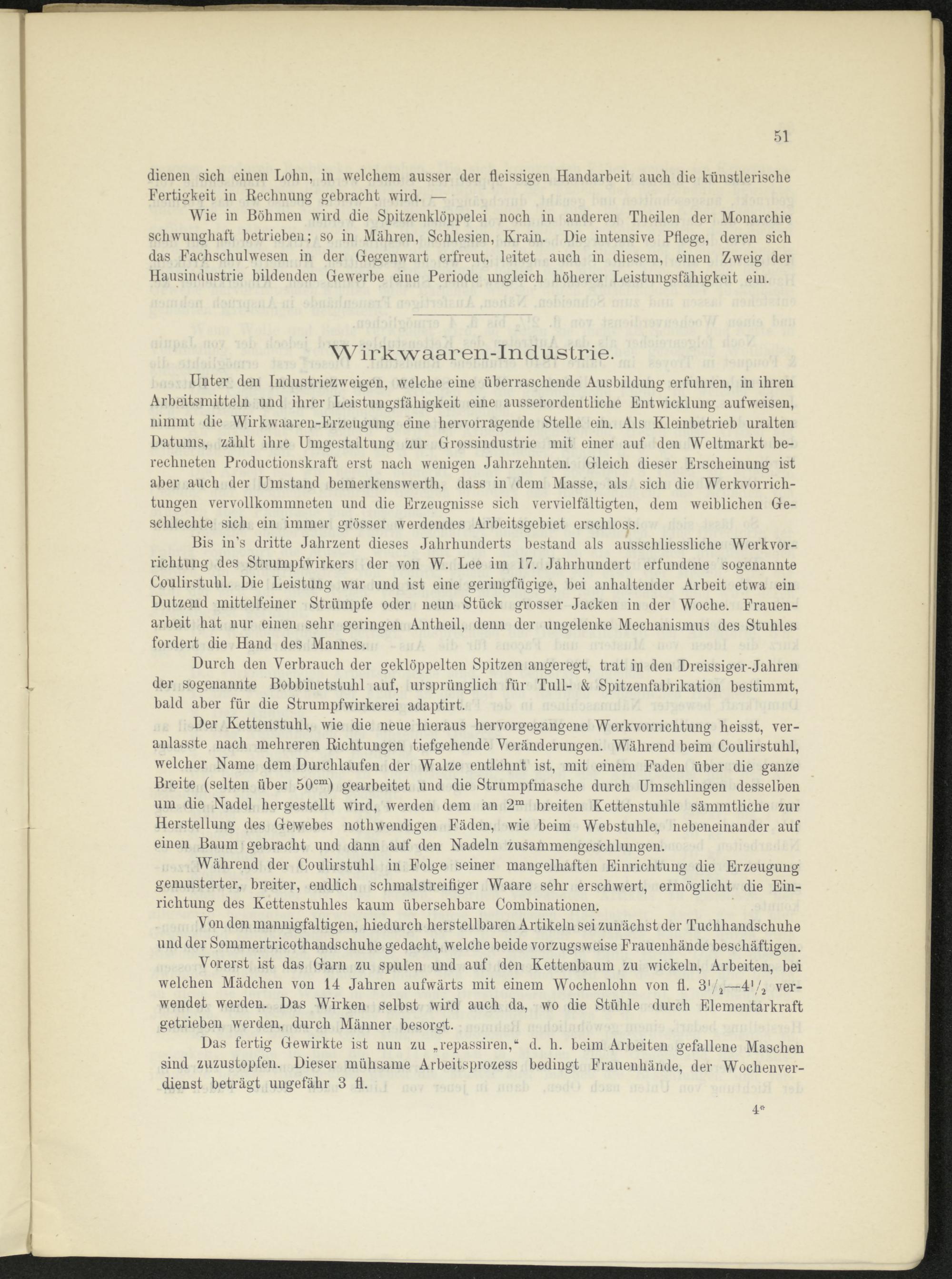 Bis in’s dritte Jahrzent dieses Jahrhunderts bestand als ausschliessliche Werkvorrichtung des Strumpfwirkers der von W. Lee im 17. Jahrhundert erfundene sogenannte Coulirstuhl. Die Leistung war und ist eine geringfügige, bei anhaltender Arbeit etwa ein Dutzend mittelfeiner Strümpfe oder neun Stück grosser Jacken in der Woche. Frauenarbeit hat nur einen sehr geringen Antheil, denn der ungelenke Mechanismus des Stuhles fordert die Hand des Mannes.