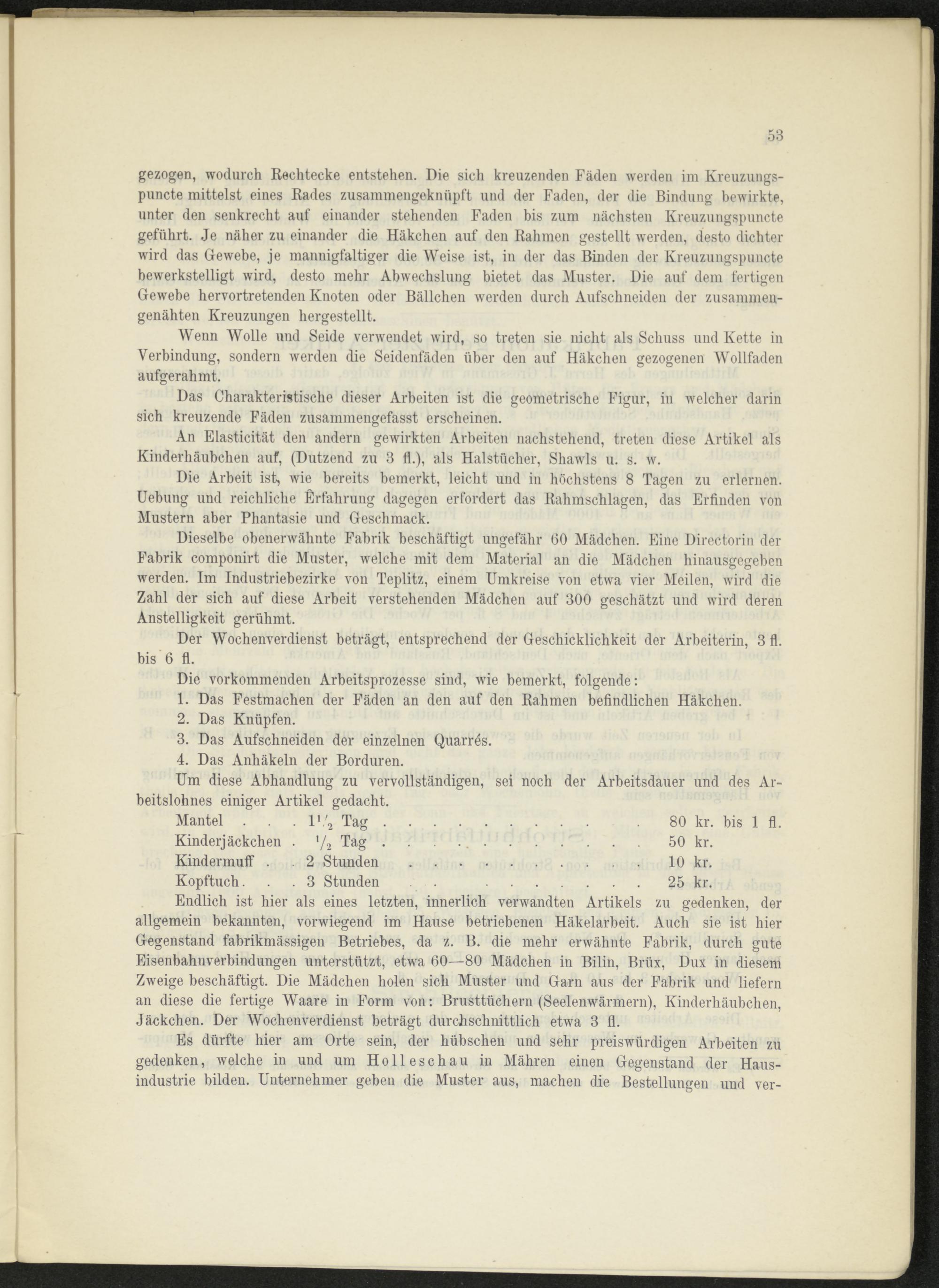 Endlich ist hier als eines letzten, innerlich verwandten Artikels zu gedenken, der allgemein bekannten, vorwiegend im Hause betriebenen Häkelarbeit. Auch sie ist hier Gegenstand fabrikmässigen Betriebes, da z. B. die mehr erwähnte Fabrik, durch gute Eisenbahnverbindungen unterstützt, etwa 60—80 Mädchen in Bilin, Brüx, Dux in diesem Zweige beschäftigt. Die Mädchen holen sich Muster und Garn aus der Fabrik und liefern an diese die fertige Waare in Form von: Brusttüchern (Seelenwärmern), Kinderhäubchen, Jäckchen. Der Wochenverdienst beträgt durchschnittlich etwa 3 11.