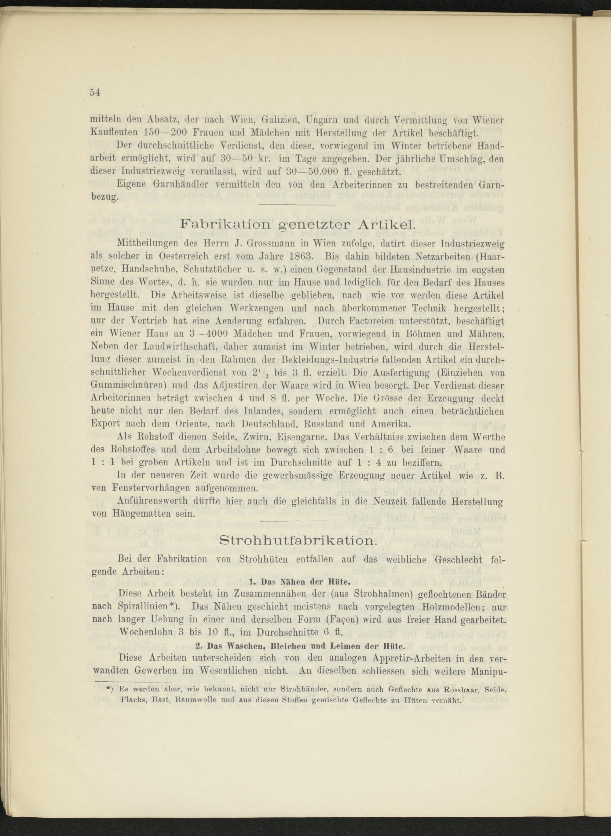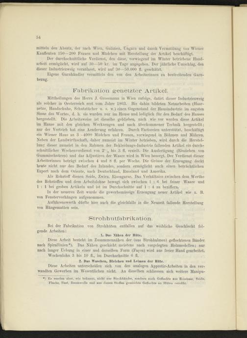 Mittheilungen des Herrn J. Grossmann in Wien zufolge, datirt dieser Industriezweig als solcher in Oesterreich erst vom Jahre 1863. Bis dahin bildeten Netzarbeiten (Haarnetze, Handschuhe, Schutztücher u. s. w.) einen Gegenstand der Hausindustrie im engsten Sinne des Wortes, d. h. sie wurden nur im Hause und lediglich für den Bedarf des Hauses hergestellt. Die Arbeitsweise ist dieselbe geblieben, nach wie vor werden diese Artikel im Hause mit den gleichen Werkzeugen und nach überkommener Technik hergestellt; nur der Vertrieb hat eine Aenderung erfahren. Durch Factoreien unterstützt, beschäftigt ein Wiener Haus an 3 -4000 Mädchen und Frauen, vorwiegend in Böhmen und Mähren. Neben der Landwirthschaft, daher zumeist im Winter betrieben, wird durch die Herstellung dieser zumeist in den Kähmen der Bekleidungs-Industrie fallenden Artikel ein durchschnittlicher Wochenverdienst von 2' 2 bis 3 fl. erzielt. Die Ausfertigung (Einziehen von Gummischnüren) und das Adjustiren der Waare wird in Wien besorgt. Der Verdienst dieser Arbeiterinnen beträgt zwischen 4 und 8 fl. per Woche. Die Grösse der Erzeugung deckt heute nicht nur den Bedarf des Inlandes, sondern ermöglicht auch eiuen beträchtlichen Export nach dem Oriente, nach Deutschland, Russland und Amerika.