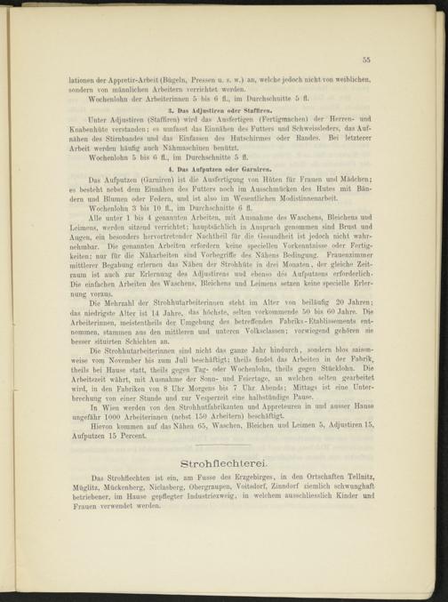 Alle unter 1 bis 4 genannten Arbeiten, mit Ausnahme des Waschens, Bleichens und Leimens, werden sitzend verrichtet; hauptsächlich in Anspruch genommen sind Brust und Augen, ein besonders hervortretender Nachtheil für die Gesundheit ist jedoch nicht wahrnehmbar. Die genannten Arbeiten erfordern keine speciellen Vorkenntnisse oder Fertigkeiten; nur für die Näharbeiten sind Vorbegrifte des Nähens Bedingung. Frauenzimmer mittlerer Begabung erlernen das Nähen der Strohhüte in drei Monaten, der gleiche Zeitraum ist auch zur Erlernung des Adjustirens und ebenso de’s Aufputzens erforderlich- Die einfachen Arbeiten des Waschens, Bleichens und Leimens setzen keine specielle Erlernung voraus.