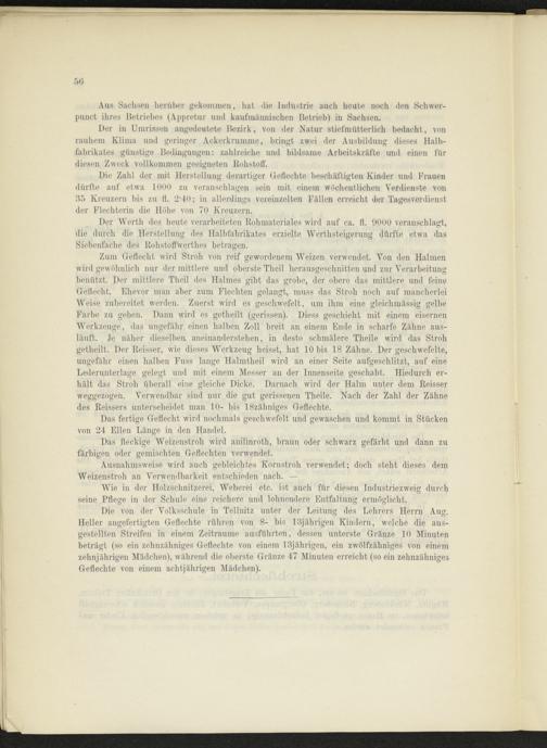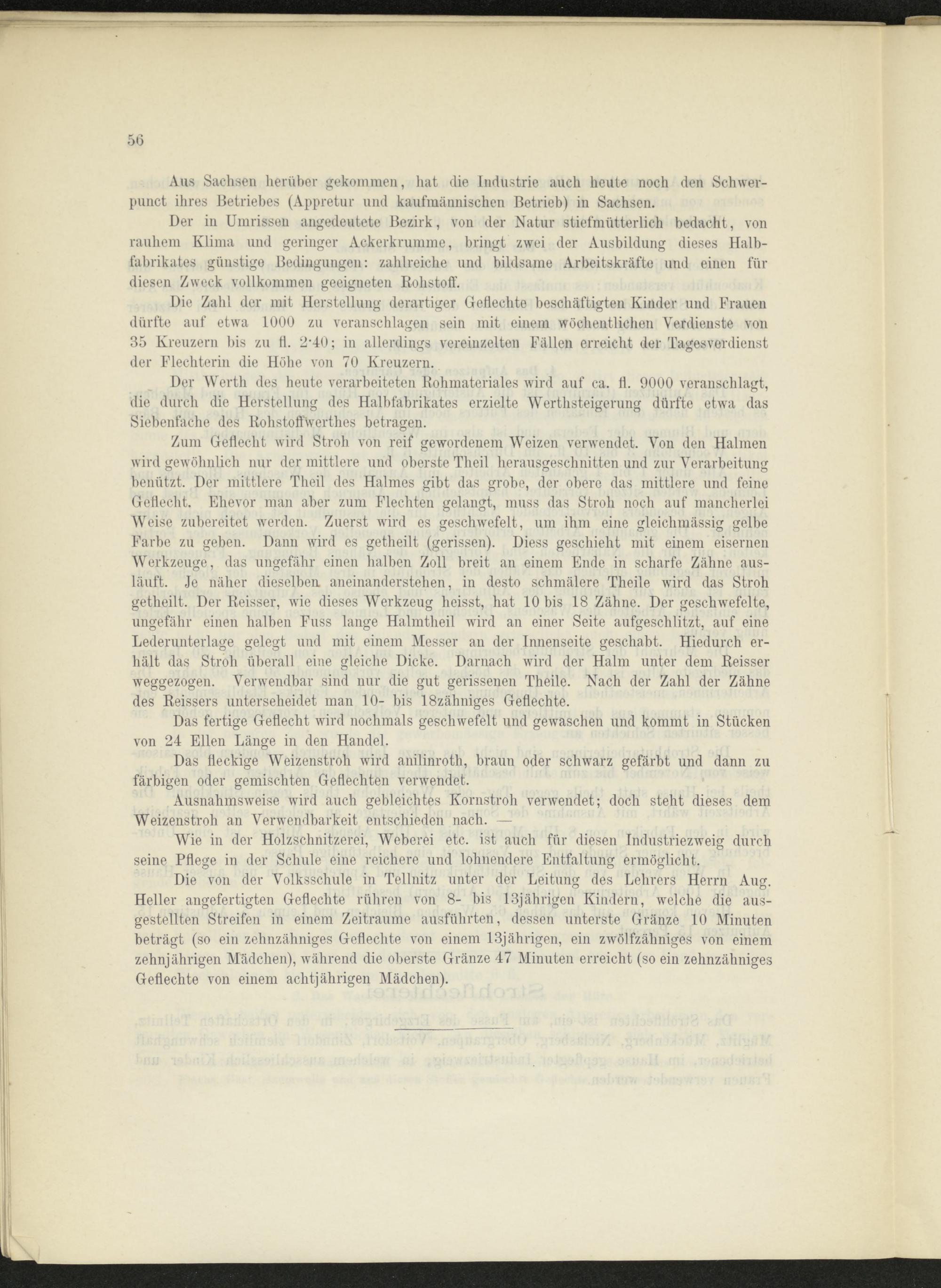Die Zahl der mit Herstellung derartiger Geflechte beschäftigten Kinder und Frauen dürfte auf etwa 1000 zu veranschlagen sein mit einem wöchentlichen Verdienste von 35 Kreuzern bis zu ff. 2*40; in allerdings vereinzelten Fällen erreicht der Tagesverdienst der Flechterin die Höhe von 70 Kreuzern.