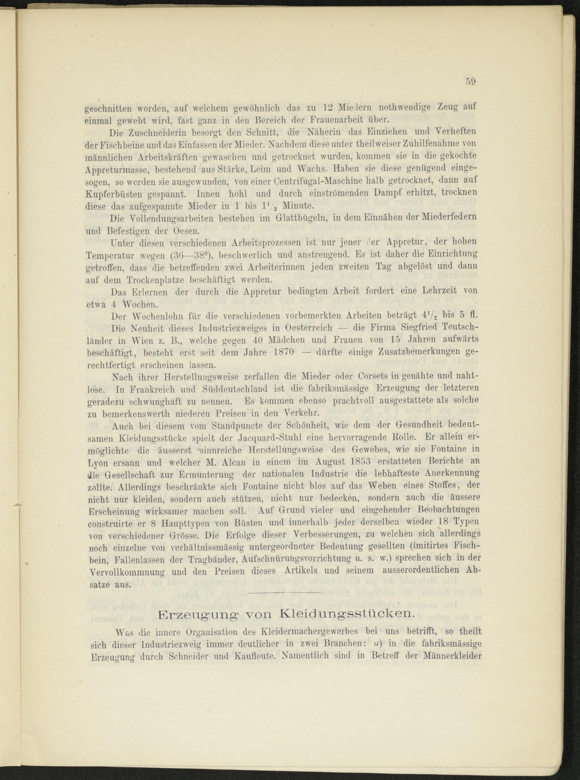 Auch bei diesem vom Standpuncte der Schönheit, wie dem der Gesundheit bedeutsamen Kleidungsstücke spielt der Jacquard-Stuhl eine hervorragende Rolle. Er allein ermöglichte die äusserst -sinnreiche Herstellungsweise des Gewebes, wie sie Fontaine in Lyon ersann und welcher M. Alcan in einem im August 1853 erstatteten Berichte an die Gesellschaft zur Ermunterung der nationalen Industrie die lebhafteste Anerkennung zollte. Allerdings beschränkte sich Fontaine nicht blos auf das Weben eines Stoffes, der nicht nur kleiden, sondern auch stützen, nicht nur bedecken, sondern auch die äussere Erscheinung wirksamer machen soll. Auf Grund vieler und eingehender Beobachtungen construirte er 8 Haupttypen von Büsten und innerhalb jeder derselben wieder 18 Typen von verschiedener Grösse. Die Erfolge dieser Verbesserungen, zu welchen sich allerdings noch einzelne von verhältnissmässig untergeordneter Bedeutung gesellten (imitirtes Fischbein, Fallenlassen der Tragbänder, Aufschnürungsvorrichtung u. s. w.) sprechen sich in der Vervollkommnung und den Preisen dieses Artikels und seinem ausserordentlichen Absätze aus.