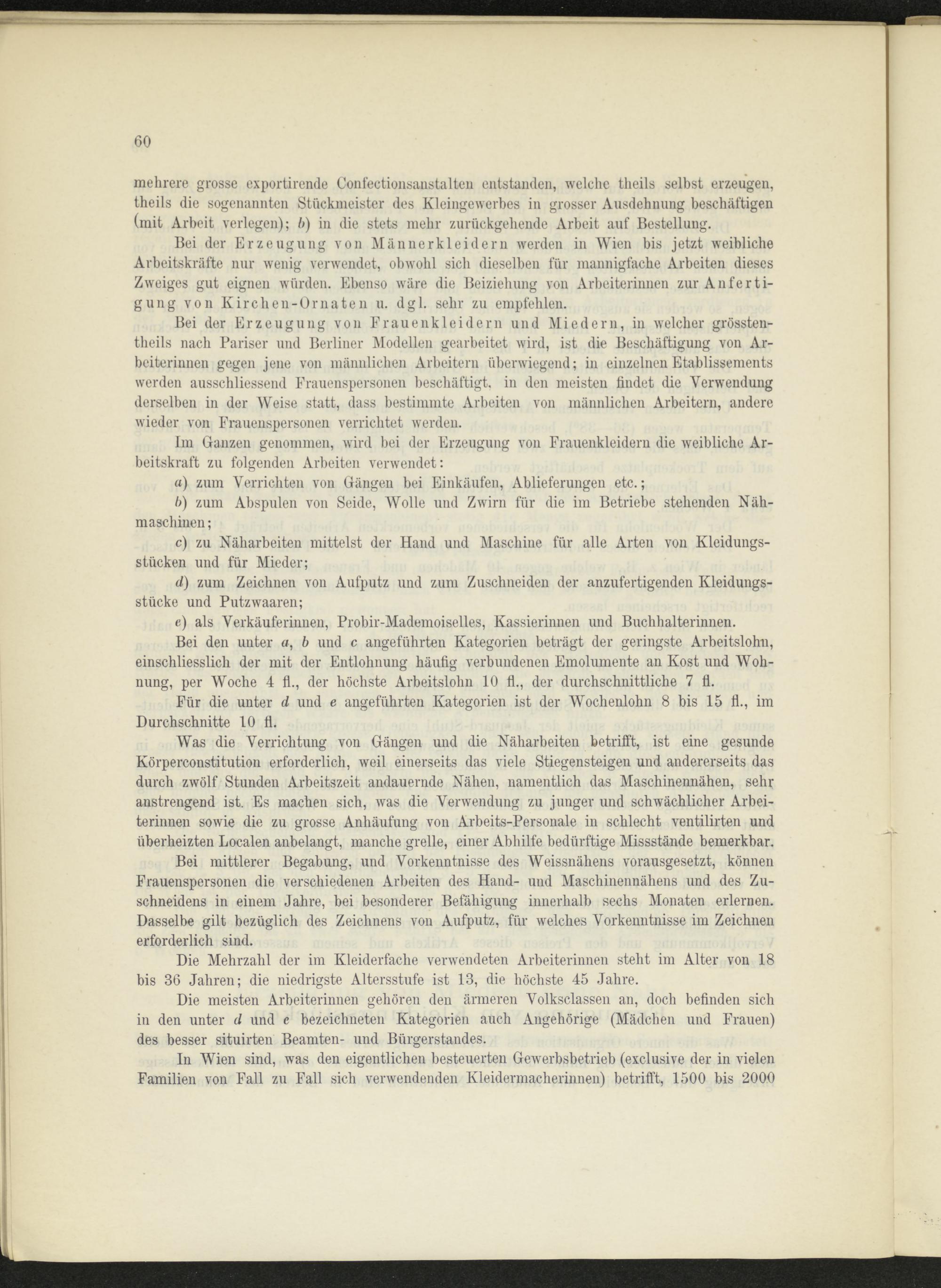 Bei der Erzeugung von Frauenkleidern und Miedern, in welcher grössten- tlieils nach Pariser und Berliner Modellen gearbeitet wird, ist die Beschäftigung von Arbeiterinnen gegen jene von männlichen Arbeitern überwiegend; in einzelnen Etablissements werden ausschliessend Frauenspersonen beschäftigt, in den meisten findet die Verwendung derselben in der Weise statt, dass bestimmte Arbeiten von männlichen Arbeitern, andere wieder von Frauenspersonen verrichtet werden.