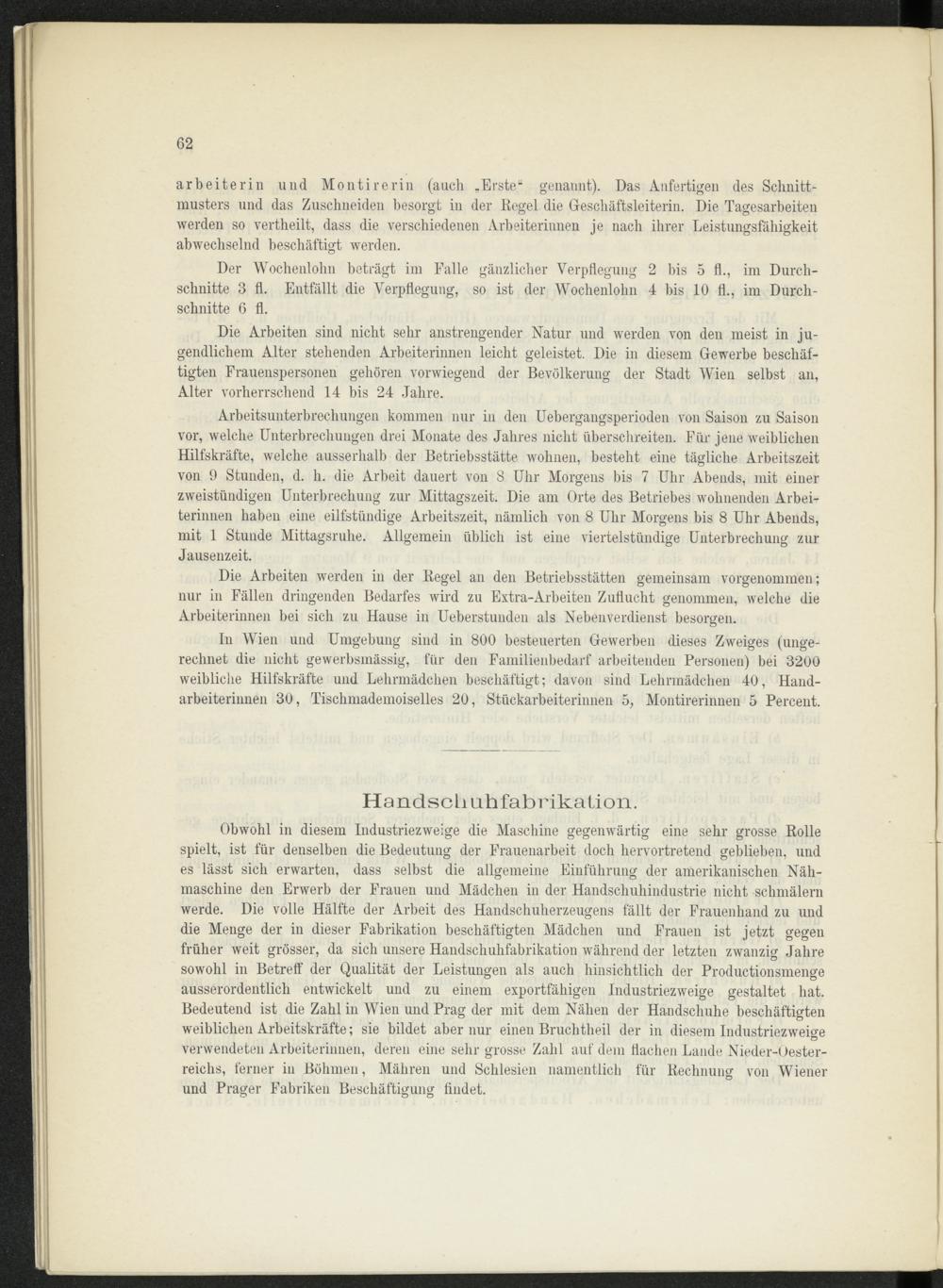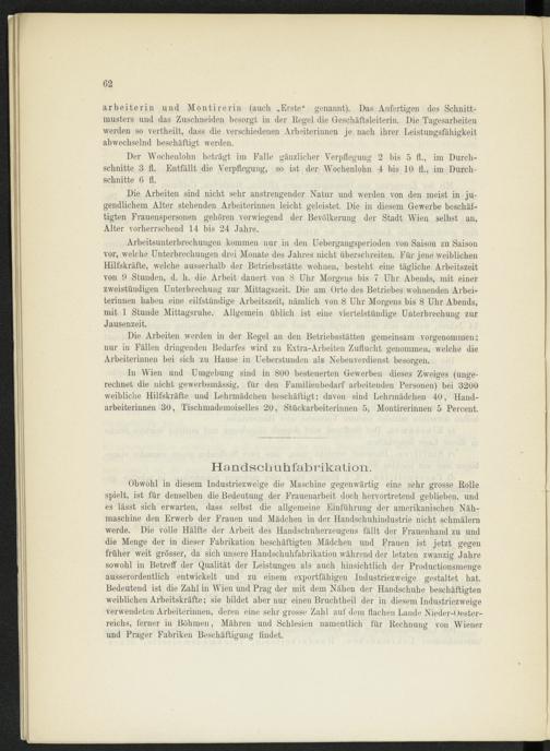 Obwohl in diesem Industriezweige die Maschine gegenwärtig eine sehr grosse Rolle spielt, ist für denselben die Bedeutung der Frauenarbeit doch hervortretend geblieben, und es lässt sich erwarten, dass selbst die allgemeine Einführung der amerikanischen Nähmaschine den Erwerb der Frauen und Mädchen in der Handschuhindustrie nicht schmälern werde. Die volle Hälfte der Arbeit des Handschuherzeugens fällt der Frauenhand zu und die Menge der in dieser Fabrikation beschäftigten Mädchen und Frauen ist jetzt gegen früher weit grösser, da sich unsere Handschuhfabrikation während der letzten zwanzig Jahre sowohl in Betreff der Qualität der Leistungen als auch hinsichtlich der Productionsmenge ausserordentlich entwickelt und zu einem exportfähigen Industriezweige gestaltet hat. Bedeutend ist die Zahl in Wien und Prag der mit dem Nähen der Handschuhe beschäftigten weiblichen Arbeitskräfte; sie bildet aber nur einen Bruchtheil der in diesem Industriezweige verwendeten Arbeiterinnen, deren eine sehr grosse Zahl auf dem flachen Lande Nieder-Oester- reichs, ferner in Böhmen, Mähren und Schlesien namentlich für Rechnung von Wiener und Prager Fabriken Beschäftigung findet.