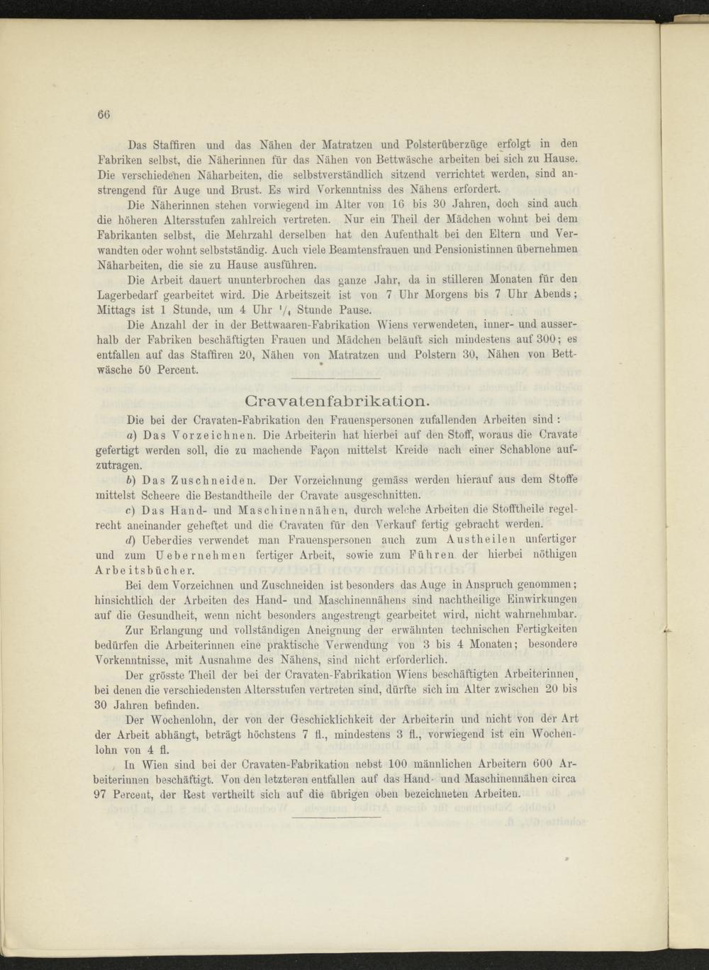 , ln Wien sind bei der Cravaten-Fabrikation nebst 100 männlichen Arbeitern 600 Arbeiterinnen beschäftigt. Von den letzteren entfallen auf das Hand- und Maschinennähen circa 97 Percent, der Best vertheilt sich auf die übrigen oben bezeichneten Arbeiten.